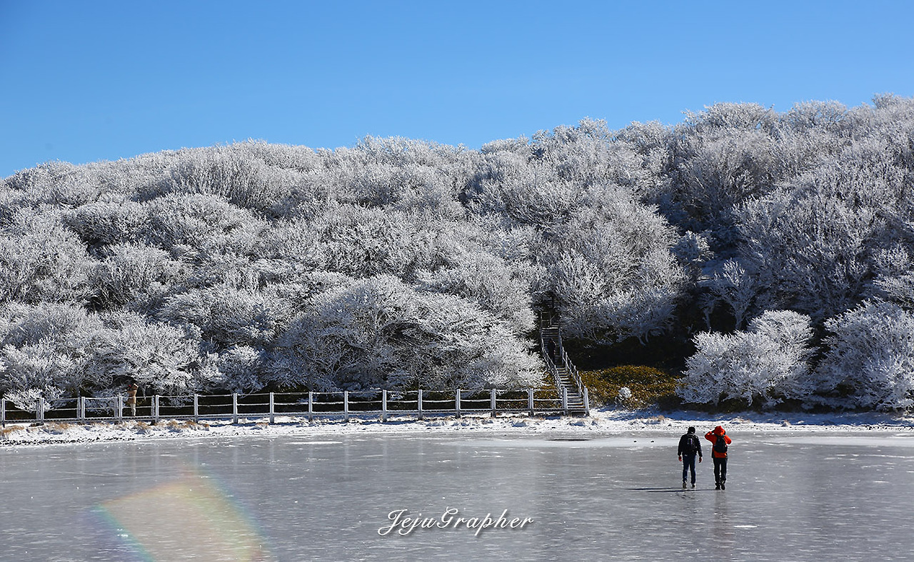 이른 새벽에 출발해서 오른 산행이었는데 하늘은 참 맑았지만 눈과 상고대가 없어서 참 실망했습니다. 사실 이틀 전까지 백록담 부근으로 많은 눈과 상고대를 볼 수 있었습니다. 하지만 전날 (휴가를 내고 올라가고 싶었지만 회의 때문에 이루지 못한...) 하루 종일 맑은 평소보다 따뜻한 날씨 탓에 상고대는 모두 신기루처럼 사라진 후였다. 세 번째 겨울 산행에서 자연이 허락하지 않은 것은 내가 볼 수가 없구나라는 생각도 했지만, 지금 허락하지 않으면 허락할 때까지 올라야겠다는 조금 오기도 생겼다. 사실 전자의 마음이 더 컸지만...