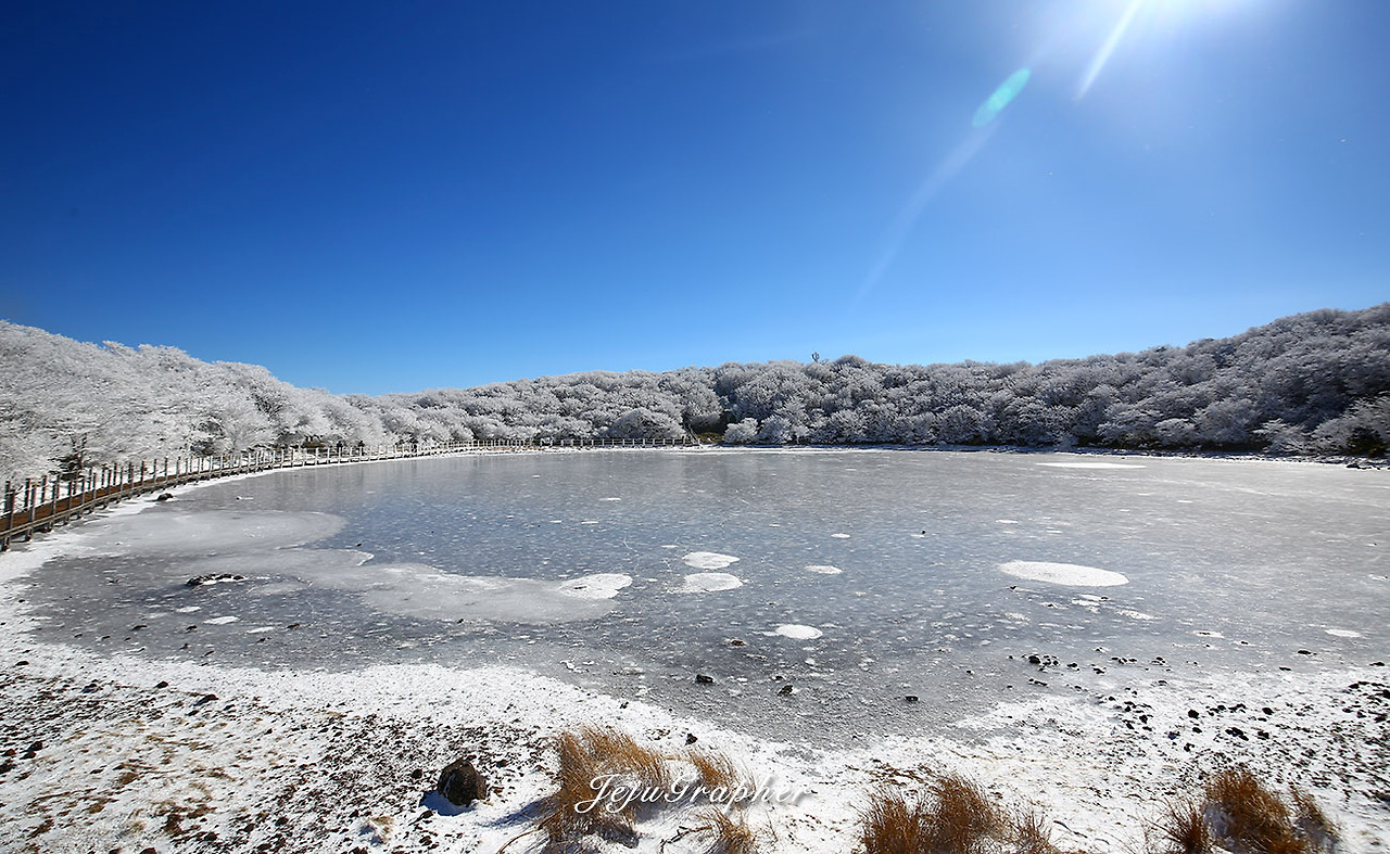 사라오름 초입에서 찍은 사진을 올리고 싶었지만 앞쪽에 등산객들이 붐비는 사진을 올리고 싶지 않았습니다. 그래서 호수에 더 가까운 곳에서 찍은 사진을 올립니다. 중천에 뜬 해 때문에 사진이 제대로 나오지 않아서 급하게 맞은편 전망대 쪽으로 발길을 옮겼습니다.