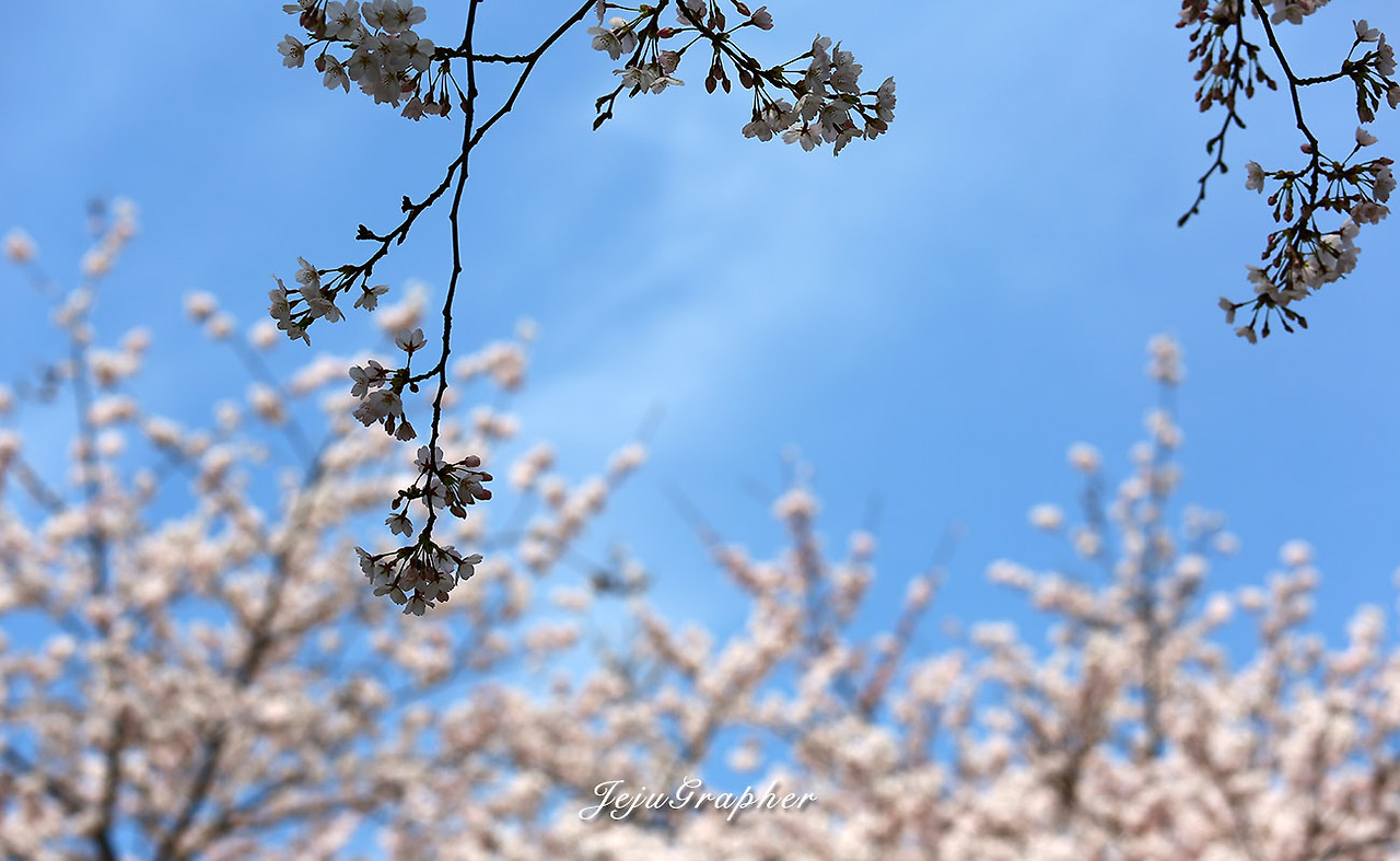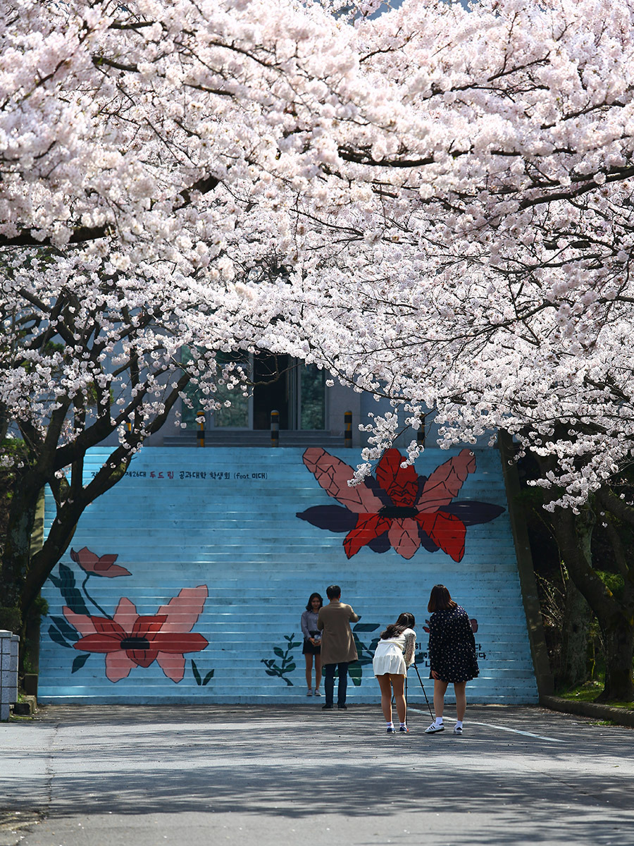 벚꽃이 필 무렵이면 제주도에는 비가 자주 내립니다. 제주에서는 이무렵 내리는 봄비를 고사리 장마라고 부릅니다. 4월 초에 비가 내리면 들녘에 어린 고사리가 자라기 시작하고 그러면 4월 말, 5월 초에 사람들이 고사리를 따러 나갑니다. 그래서 4월 초에 내리는 비를 고사리 장마라고 합니다. 예년 같았으면 고사리 장마에 벚꽃이 다 졌을 텐데, 올해는 개화 시기가 조금 늦어서 비 온 후에도 벚꽃이 그대로입니다. 4월 초에는 날씨가 흐리기도 하지만, 요즘은 미세먼지가 심해서 봄에 푸른 하늘을 볼 수 있는 기회가 많지 않습니다. 그래서 푸른 하늘을 배경으로 한 벚꽃 사진이 점점 귀해집니다. ㅠㅠ 제주대학교는 제주에서도 대표적인 벚꽃놀이 장소입니다. 보통 제주대 앞 큰길과 중앙의 너른 잔디밭 주변에서 꽃놀이를 즐기는데, 개인적으로는 공대 쪽의 벚꽃이 좋습니다. 어느 종합대학교를 가더라도 공대는 오래전부터 존재해서 공대 건물은 많이 낡은 경우가 많습니다. 덕분에 공학관 주변의 수목들의 연한이 커서 크고 울창합니다. 그래서 제주대학교의 공학관 주변의 벚꽃이 좋습니다.