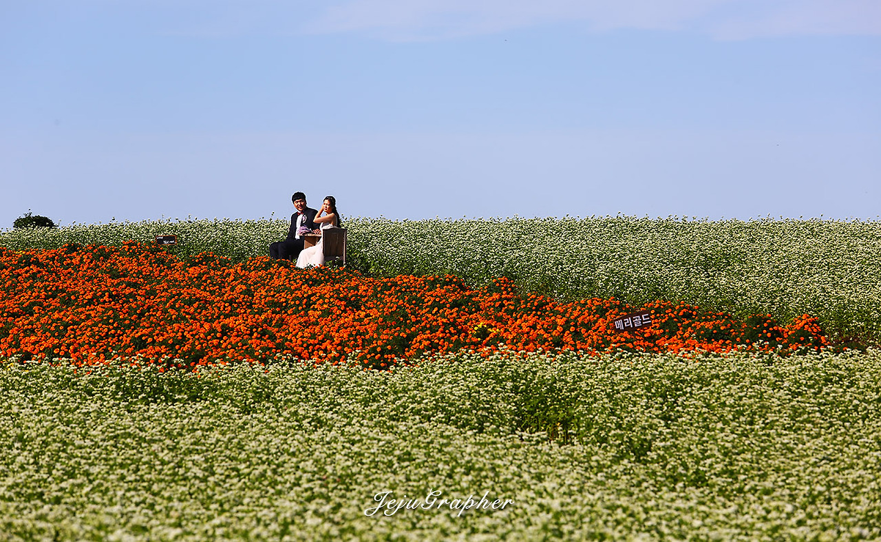 남쪽으로 가보고 싶었다. 남쪽이라면 서귀포 밖에 없는데... 오라 메밀밭은 이미 다녀왔기에 보롬왓에 들렀다가 서귀포로 내려가는 코스를 계획했다. 이곳도 불과 2년 전만 해도 알려지지 않았었는데, 지금은 봄가을로 메밀꽃이 필 때면 사람들이 많이 찾는다. 메밀밭 한 켠에 카페를 오픈한 후로는 메밀뿐만 아니라 계절에 맞는 다양한 꽃도 심어뒀다. 봄 메밀이 끝날 무렵에는 잉글리시 라벤더가 폈는데, 가을 메밀이 필 무렵에는 메리골드의 예쁘게 꽃을 피웠다. 그리고 봄과 가을 중간에 수국길이 알려져서 많은 이들이 찾았다. 이젠 유명해진 곳이기는 하지만 오늘 유난히 주차장에 차가 많았다. 날씨가 좋아서 웨딩 사진을 찍으러 온 사람들도 많았지만, 오늘 (금)부터 주말 행사를 진행 중이었다. 개그맨 김재욱, 곽범, 이창호가 내려와서 사람들과 어울려서 행사를 하고 있었다.