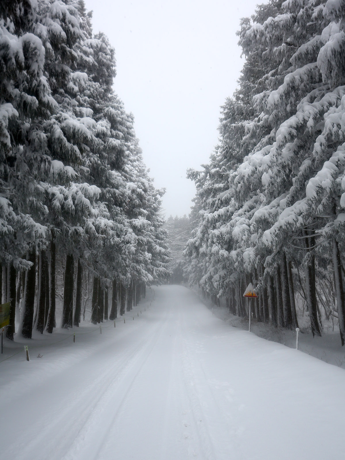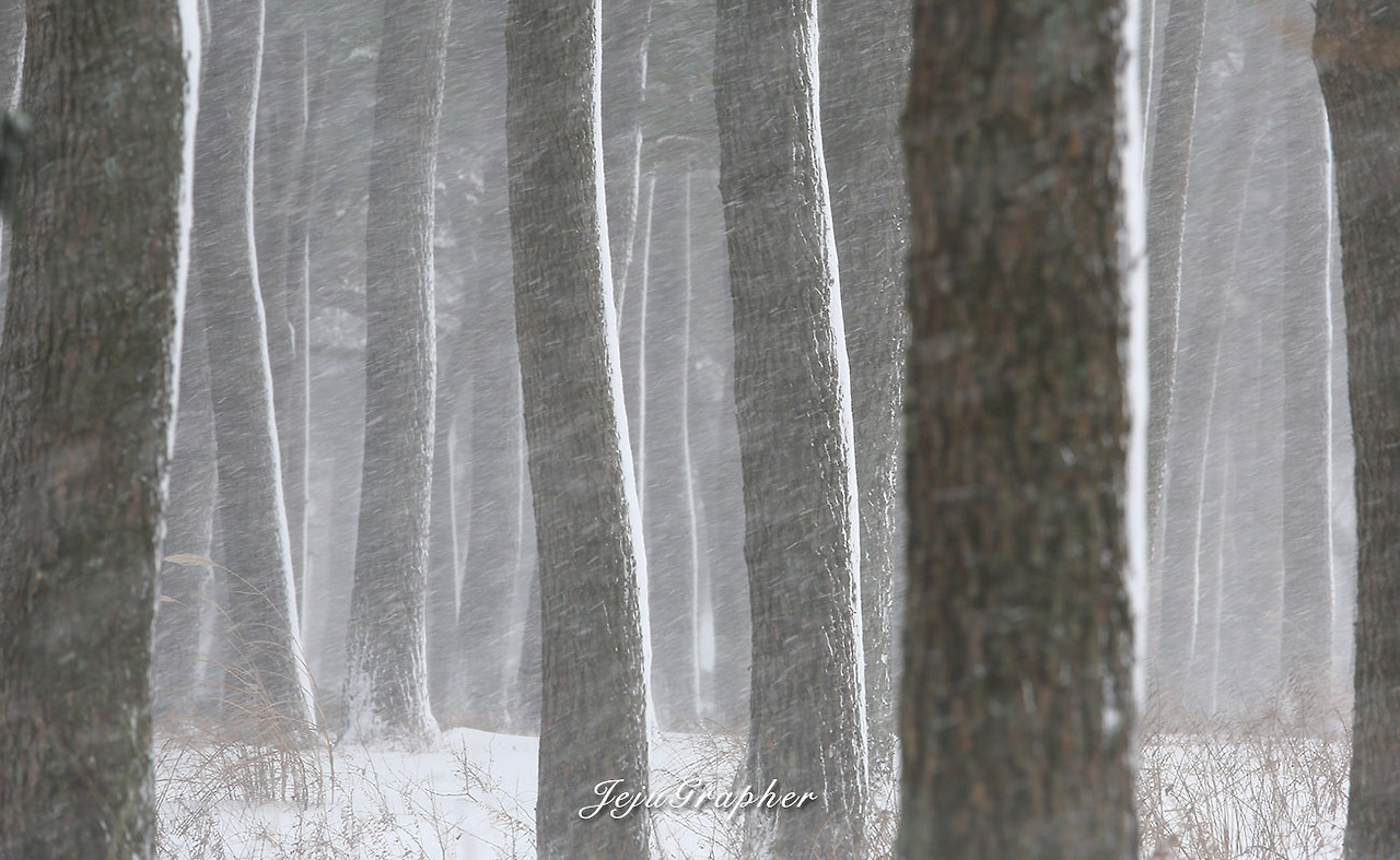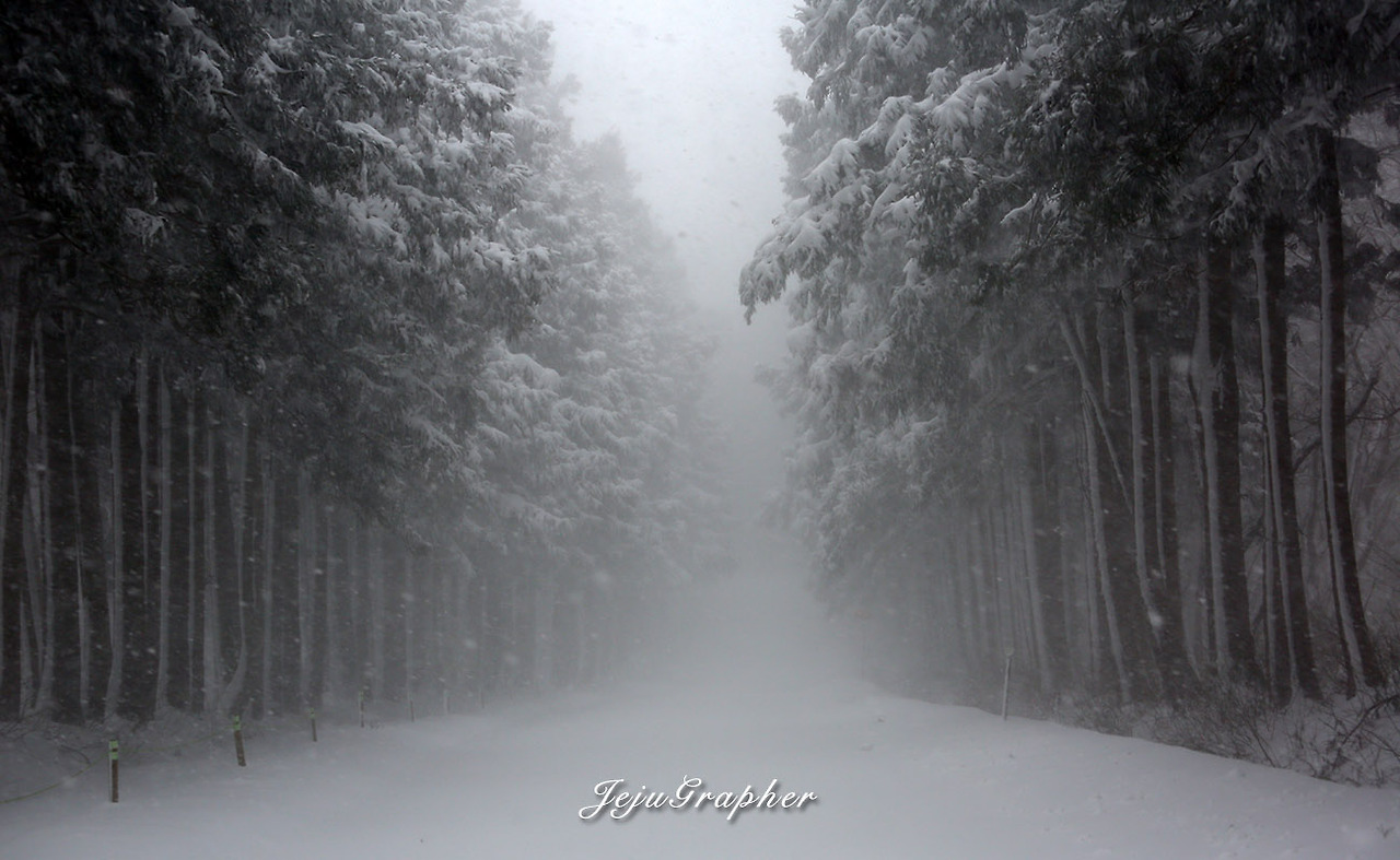 뒤에서 밀어주는 눈바람에 힘을 얻어 비자림로까지 마침에 다다랐습니다. 아주 기대했던 만큼의 눈이 쌓인 것은 아니지만 지난 두 번의 실패는 보상해줄 만큼의 눈이 쌓여있었습니다. 그런데 거센 바람에 날리는 눈발 때문에 사진을 찍어도 눈으로 보고 있는 걸 제대로 표현이 되지 않습니다. 그래도 여기까지 올라왔으니 비자림로 깊숙이까지 걸어가 보기로 했습니다.