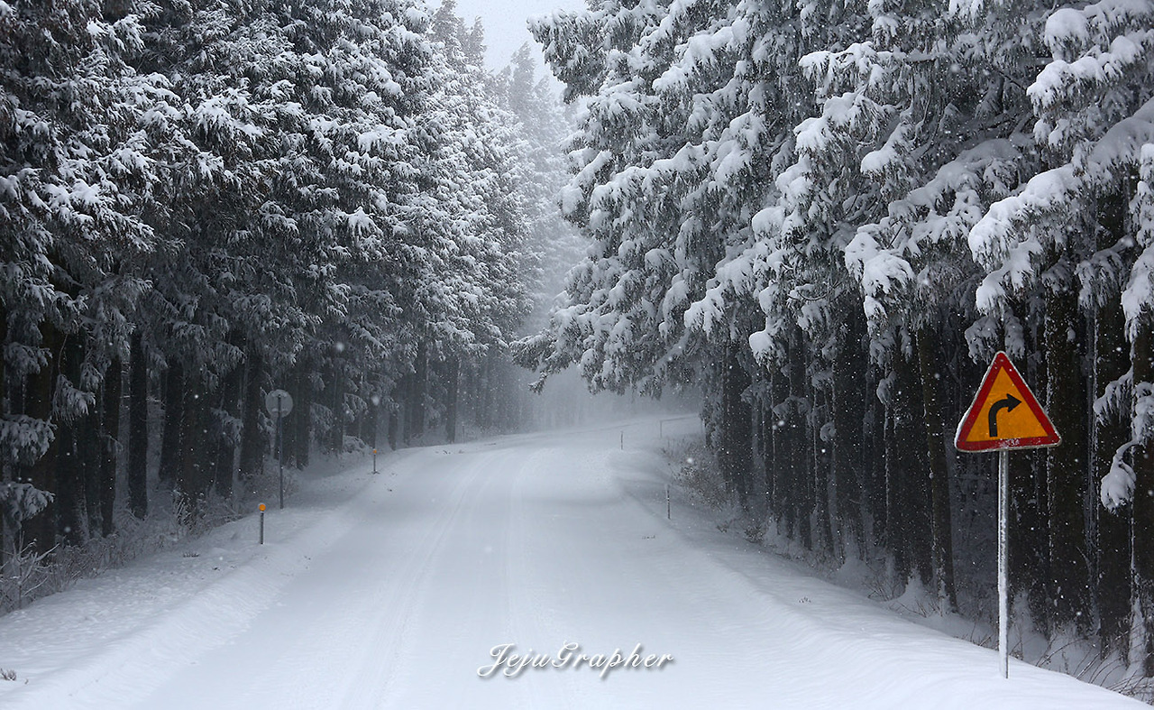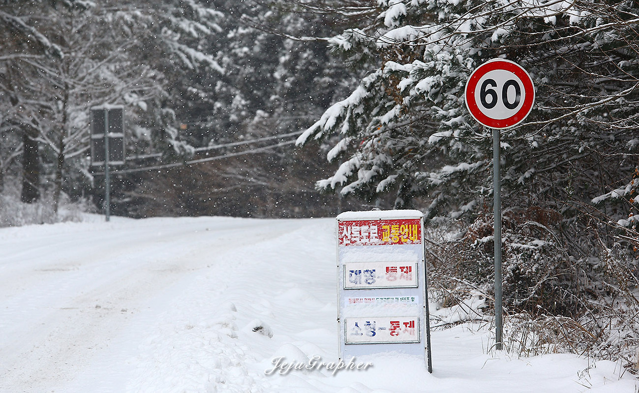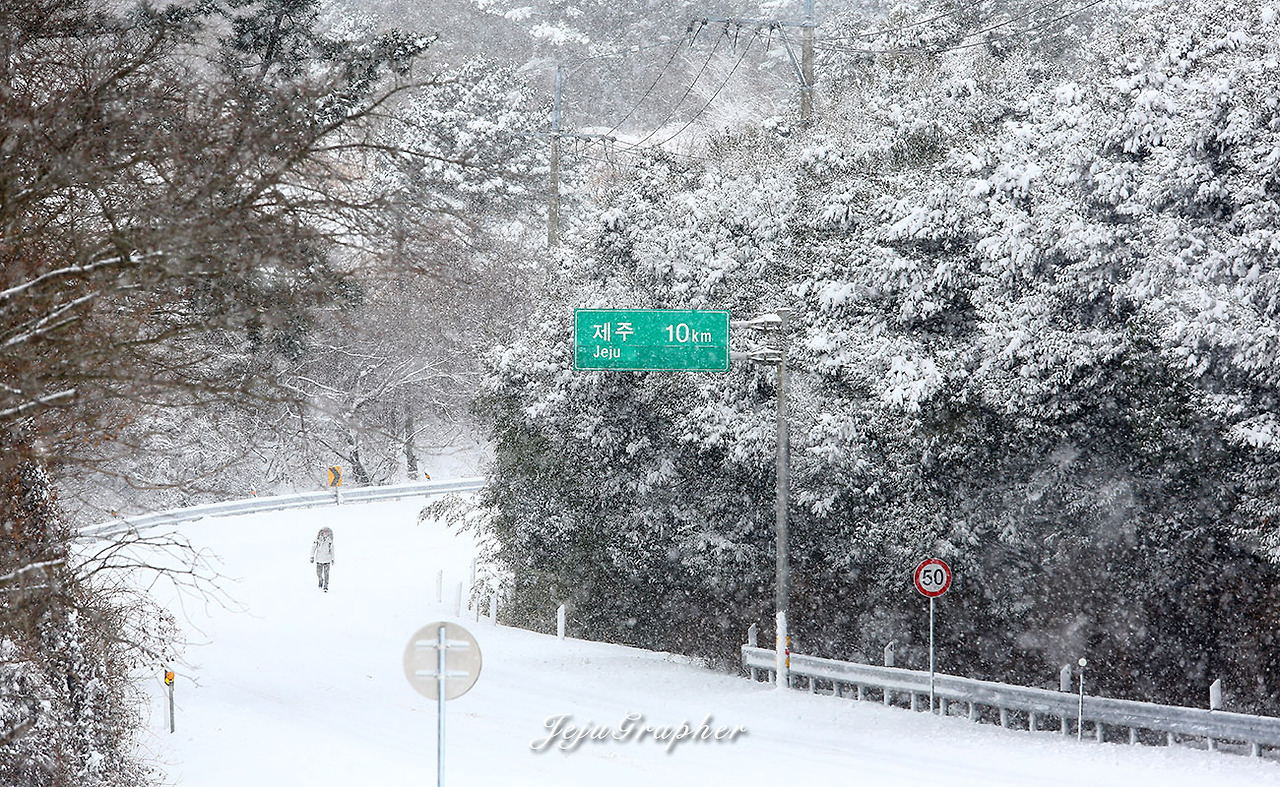금요일 아침 일단 휴가 신청하고 (회사의 휴가 정책이 까다롭지 않다는 점은 참 다행입니다.) 사진을 찍으러 나갈까 말까를 고민했습니다. 지난 며칠간 눈은 많이 내렸지만 윈드시어가 발동될 만큼 바람이 세게 불어서 비자림로의 삼나무에 눈이 제대로 쌓여있을까? 가 의심스러웠습니다. 그래도 무작정 집에만 있을 수가 없다는 생각에 그냥 마을 주변이라도 사진을 찍자는 생각으로 길을 나섭니다. 계획은 지난주처럼 버스를 타고 비자림로까지 가서 집까지 걸어내려오는 것입니다. (https://brunch.co.kr/@jejugrapher/183) 그런데 한라산 516도로를 운행하는 모든 버스가 운행중단입니다. 보통 때는 오전 10시경이면 눈길이 웬만큼은 다 녹아있고 또 516도로가 주요 도로라서 재설을 완료했겠지만, 한파로 눈은 녹지 않았고 이번에는 시내에 내린 눈을 먼저 제설하느라 한라산을 통과하는 도로의 제설은 늦어졌습니다. 비자림로까지는 거의 8km나 가야 하고 또 돌아오는 것도 고려해야 하니 선뜻 나서는 것이 망설여졌지만, 가는 데까지만 가보자는 생각으로 일단 걷기 시작했습니다.