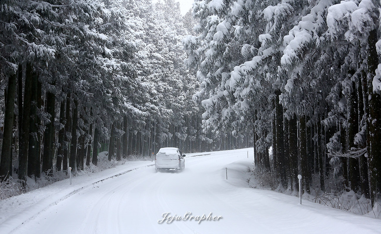 힘들게 비자림로까지 걸어서 왔는데 반대편에서 4륜구동 SUV 한대가 휙하니 지나갑니다. 제가 도착했을 때는 아무도 밟지 않은 길이었는데... 평소에는 세단을 더 선호하는 편이지만, 이런 극한 환경을 고려해서 (월동장비를 갖춘) 4륜구동의 SUV를 타고 다녔어야 했는데라는 아쉬움이 살짝 남는 순간... (마지막에 동영상을 찍을 때는 더욱 그런 생각이 간절했습니다.)