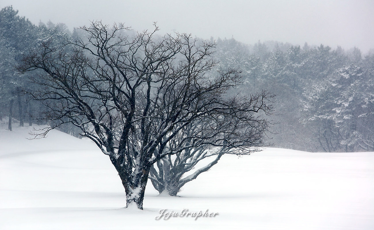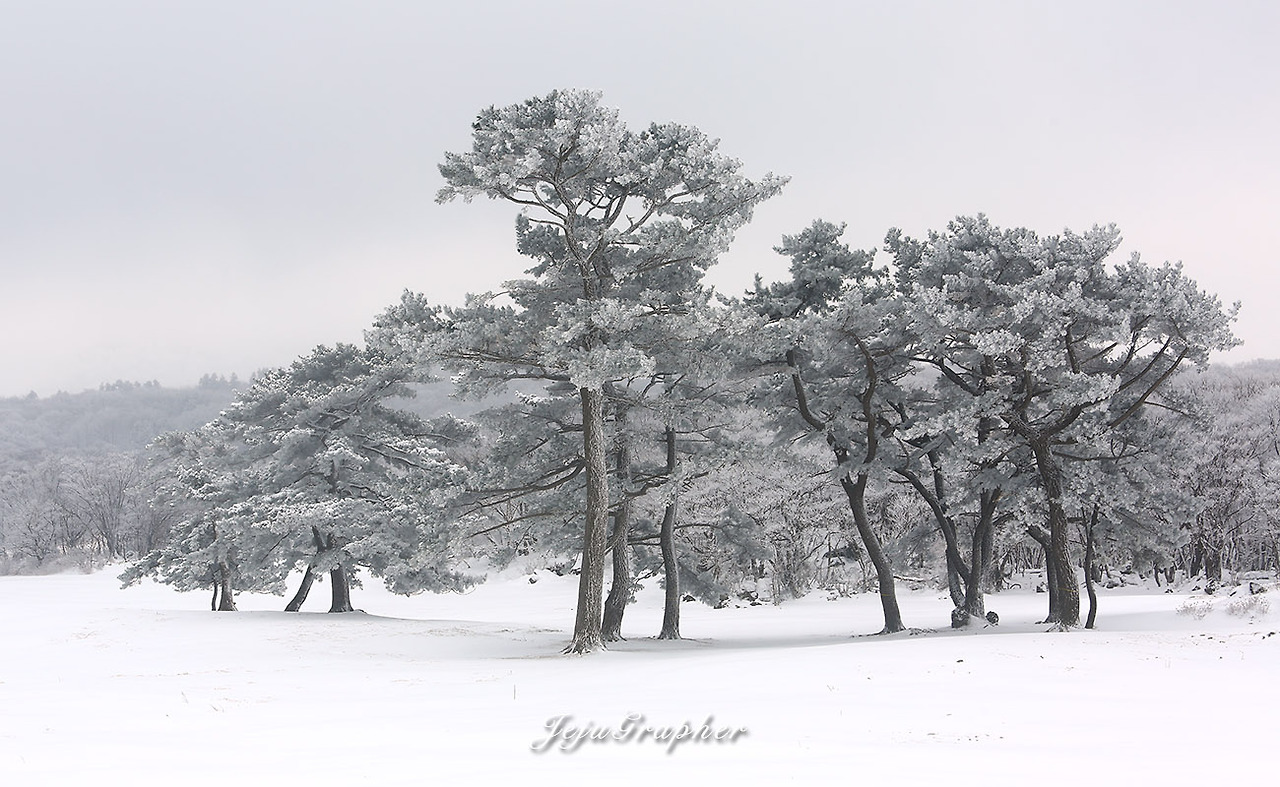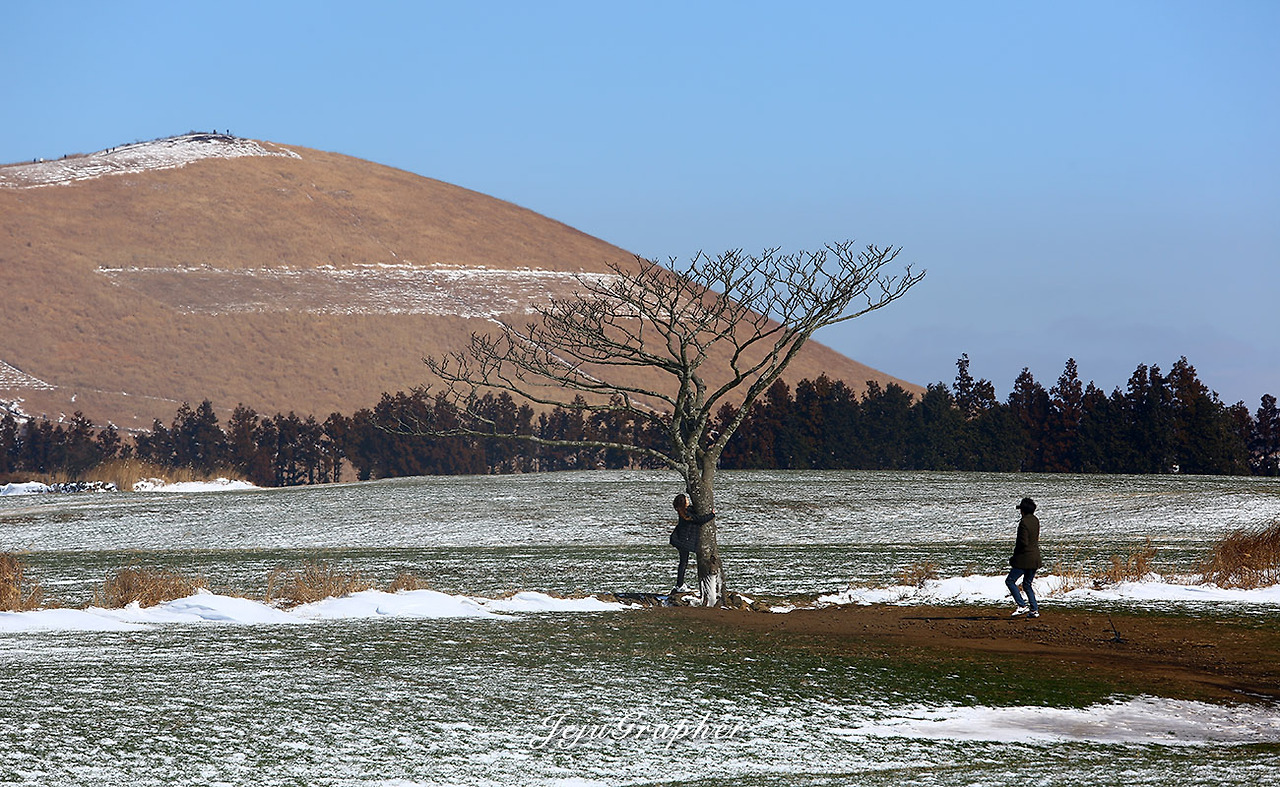 1100도로를 넘어가서 서귀포의 녹차밭에서 백록담을 배경으로 사진을 찍으려고도 했지만 남쪽에는 구름이 많이 껴서 백록담이 제대로 보이지 않습니다. 그래서 근처 주유소에서 주유 후 바로 나홀로나무로 향했습니다. 그런데 이미 눈이 많이 녹거나 바람에 날려갔고 용케 찾아온 관광객들이 여럿 보여서 길가에서 몇 컷만 찍고 집으로 돌아왔습니다.