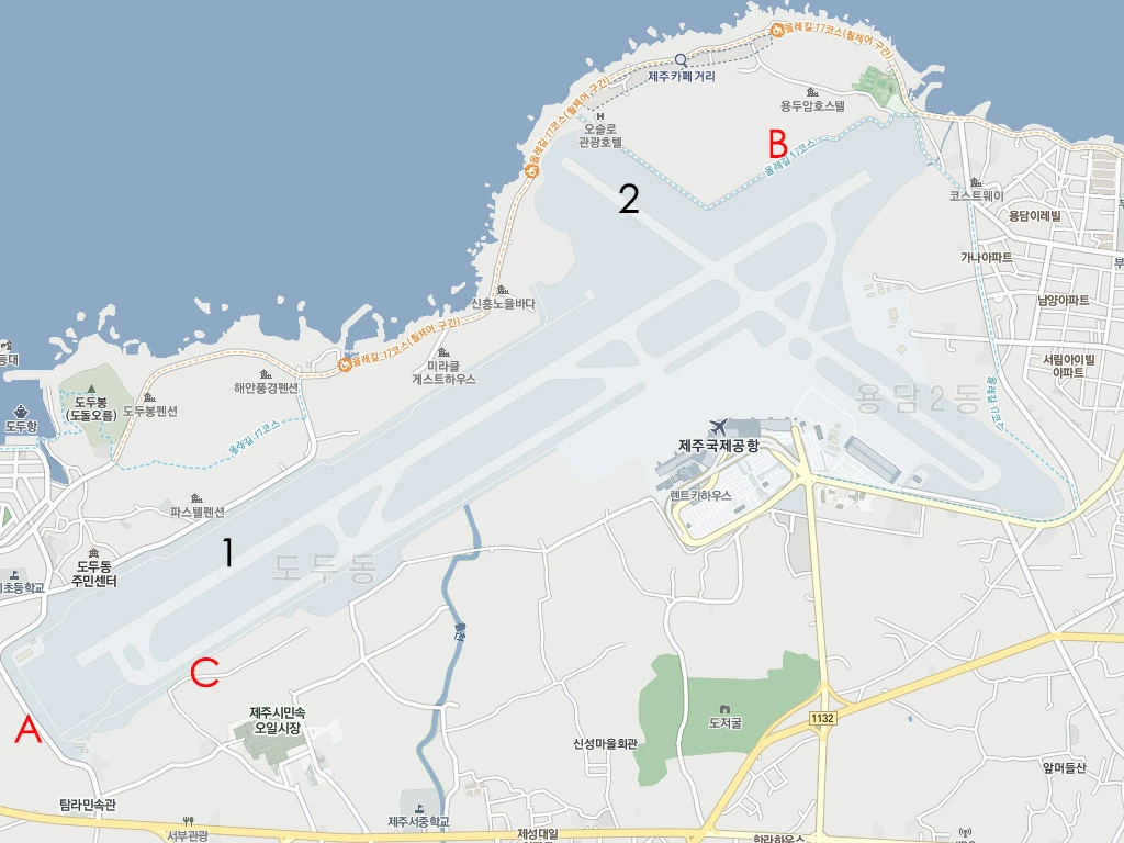 제주 공항 및 촬영 스팟에 대해서 짧게 설명하겠습니다. 제주공항은 제주도의 북쪽은 용담동에 위치해있습니다. (아래 지도 참조) 북동~남서로 이어지는 긴 활주로 (1)와 북서~남동으로 이어지는 짧은 활주로 (2)가 있습니다. 보통 1번 활주로를 이용하지만, 조금 작은 비행기의 경우 2번 활주로를 이용해서 이륙하는 경우도 있습니다. 정상적이라면 2번 활주로를 통해서 모든 비행기가 이착륙이 가능하지만, 비상사태를 위해서 긴 활주로를 주로 이용합니다.1번 활주로를 기준으로, 날씨가 좋은 날은 북동에서 남서쪽으로 이착륙하고, 날씨가 나쁘면 남서에서 북동쪽으로 이착륙을 합니다. 지도의 A 지점에 비행기 유도등이 있기 때문에 그렇습니다.