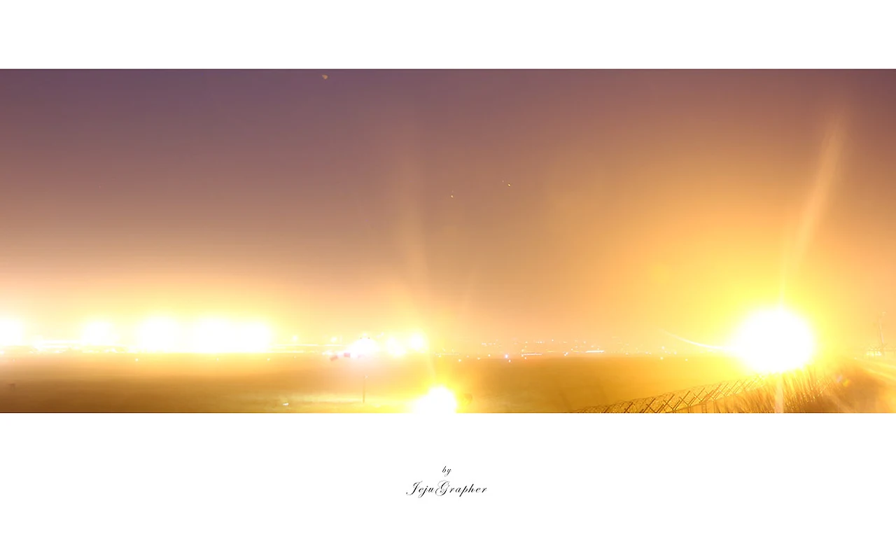 제주는 비행기 궤적 사진을 찍기에 좋은 장소이면서 또 나쁜 장소입니다. 다른 지역보다 유리한 점은 공항 주변이 거의 오픈돼있어서 밖에서 공항 활주로를 볼 수 있다는 점과 (인천, 김포, 김해를 제외한다면) 다른 공항에 비해서 비행기 이착륙이 잦다는 점입니다. 활주로 조망이 좋더라도 비행기 이착륙이 거의 없다면 한번 기회를 놓치면 다음 기회까지 시간이 너무 오래 걸립니다. 역으로 불리한 점으로는 안개/해무가 잦아서 결항하거나 이착륙 장면/순간을 눈으로 확인할 수 없는 경우가 있습니다. 그리고, (비가 오거나) 바람이 심한 날이 많아서 카메라를 고정할 수가 없습니다. 보통 20~30초 정도 장노출시켜야 하는데 삼각대로 고정하더라도 카메라가 흔들려서 예쁜 사진을 담을 수 없습니다.