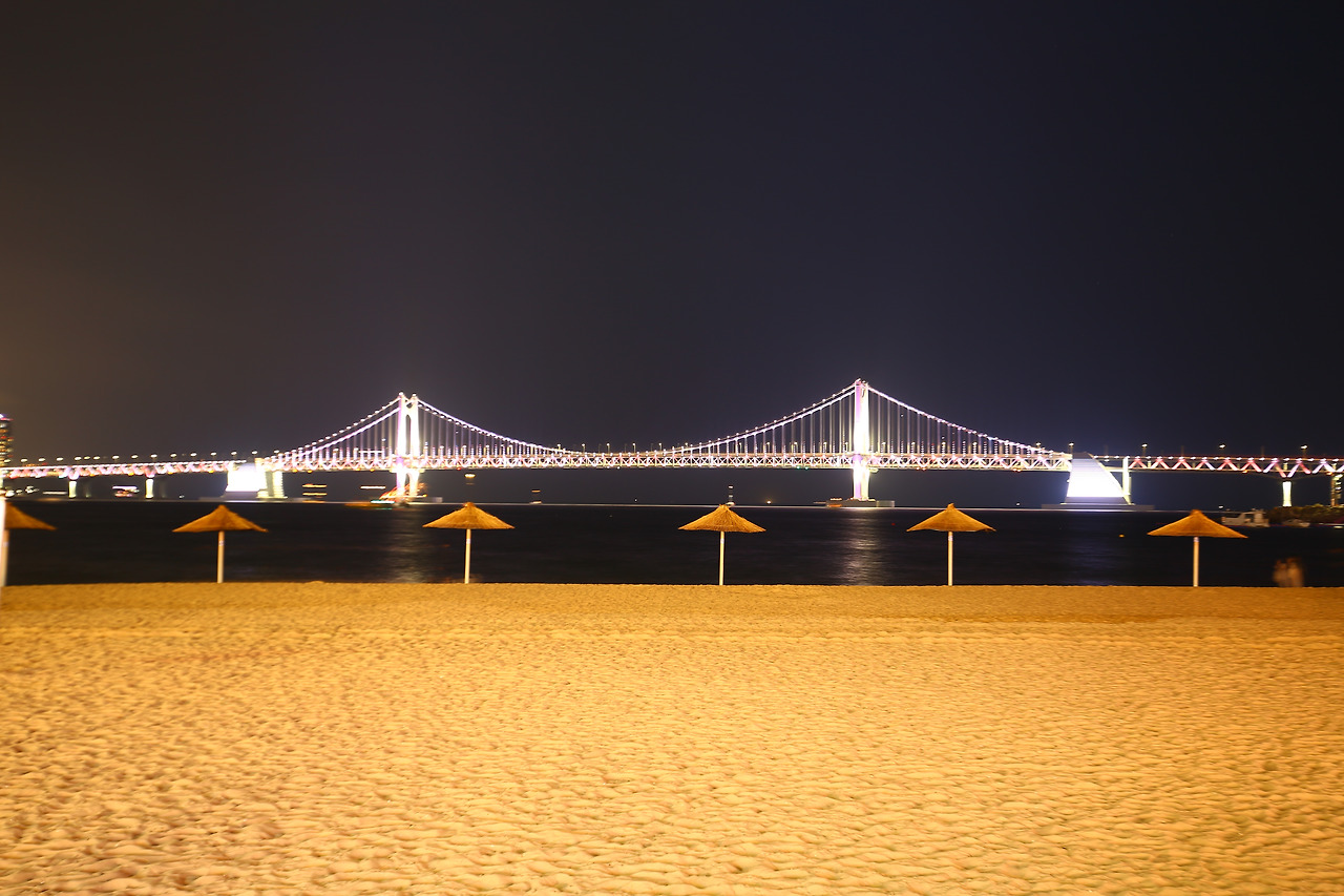 그리고 저녁이 돼서 숙소인 광안리로 돌아왔습니다. 애초 부산으로 워크숍을 간다고 했을 때부터 가장 기대했던 광안리의 야경 사진을 더디어 찍을 수 있게 됐습니다. 마트에 장 보러 간 동료들이 아직 돌아오지 않아서 카메라를 챙겨서 해변으로 나가서 광안대교 샤진을 찍었습니다. 타이밍을 잘못 맞춰서 화려한 불빛의 사진을 찍지 못한 게 다소 아쉽지만... 부산 야경 사진으로 유명한 더베이101에도 가보고 싶었지만 숙소에서 다소 멀고, 단체 행동에서 어긋나서 그냥 참았습니다.