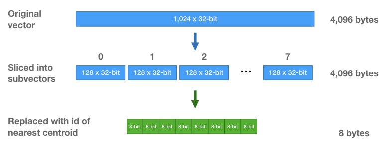 PQ를 간략히 설명하면, 긴 원본 데이터 (그림에선 4096차원 float 벡터)를 균등하게 몇 개의 서브벡터 (그림에서 8개)들로 쪼갠다. 쪼갠 각각의 서브벡터/데이터를 k-means 알고리즘을 이용해서 클러스터링 하고 각 서브 샘플들을 클러스터의 centroid index로 매핑한다. 그러면 하나의 샘플은 (그림에선) 정수형 인덱스를 갖는 8차원 정수 벡터가 생성된다. 위의 k-mean 클러스터링을 할 때, k값을 256으로 설정해서 색인의 범위가 0에서 255가 되어서 1바이트 (8비트), 즉 정수 값으로 표현한다. (256은 고정값이 아님) 각 서브벡터를 각각 클러스터링 하고 각 서브 샘플을 [0, 255] 값을 갖게 만든다. 애초에 4096차원의 float형 벡터가 최종 8차원의 정수형 벡터로 변환되어 메모리 사용량이 급격히 줄어들고, 이런 approximation을 통해서 연산 속도가 향상된다. 물론 approximation이므로 정확도는 다소 손실된다 (information loss).
