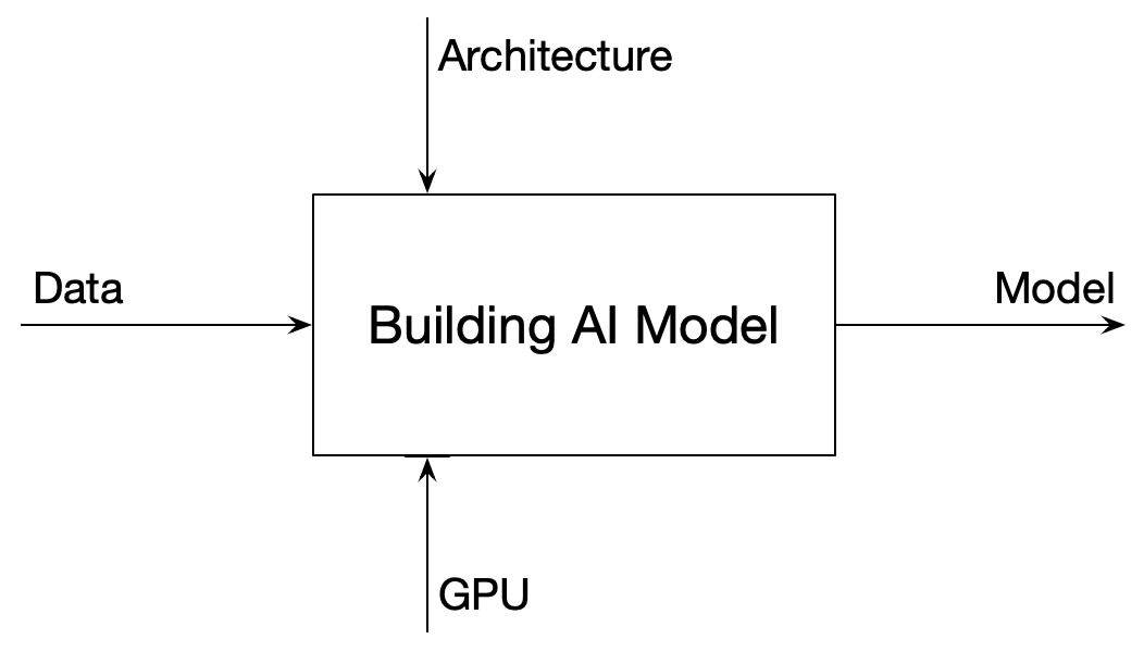 어떤 문제를 해결할 AI 모델을 만드는 과정을 아래 Functional Model처럼 그릴 수 있다. GPU로 대표되는 적당한 하드웨어를 갖고 있으면 문제에 맞는 모델 아키텍처와 알고리즘으로 관련 데이터로 모델을 학습하면 해당 문제에 특화된 AI 모델이 만들어진다. 문제 복잡도에 따라 아키텍처 종류나 규격 또는 필요한 데이터 양이 다를 수 있으나 잘 훈련된 혼자 또는 소수의 데이터 과학자 (또는 요즘은 그냥 개발자)만 있으면 꽤 괜찮은 모델을 학습해서 운영할 수 있’었’다. 지난 1년을 되돌아보면 LLM과 Diffusion 모델로 대표되는 생성형 AI가 대중에게 소개되면서 AI 모델을 구축하는 양상이 바뀌었다. 고전이 여전히 필요하지만 거대함이 요즘의 핵심이 됐다.