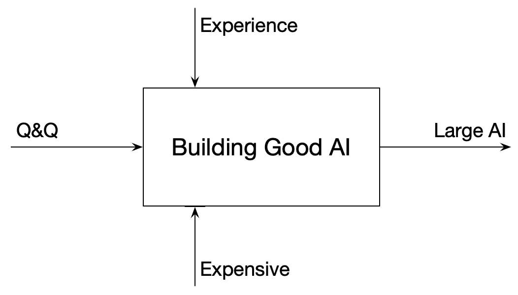 요즘의 거대 AI 모델을 구축하는 것도 위의 그림과 기본적으로 같지만, 양상은 조금 바뀌었다. 아래에 그렸듯이, 1) 양질의 데이터가 엄청나게 더 많아야 한다 (Quality & Quantity), 2) 기본 모델 아키텍처는 큰 변화가 없으나 잘하려면 경험/노하우가 많은 과학자/엔지니어가 많이 필요하다, 3) 게임용 GPU 장비 몇 대로 해결되지 않고 클라우드와 GPU 팜이 필요하다. 뿐만 아니라, 결과 AI 모뎃을 운영 (inference) 비용은 더더욱 감당하기 어렵다. 어차피 모델 (트랜스포머 아키텍처)는 공개됐기 때문에 누구든 마음만 먹으면 괜찮은 LLM 모델을 만들 수 있다. 그러나 아무나 만들 수 없게 됐다는 게 이 글의 요점이다. (기술적으로) 만드는 건 아주 쉽지만 (재정적으로) 만들 수 있는 것은 매우 어렵다. 아주 어마무시하게 많은 돈이 있는 사람 또는 집단만이 AI 설루션을 만들어서 제공하는 시대가 됐다는 자조다.