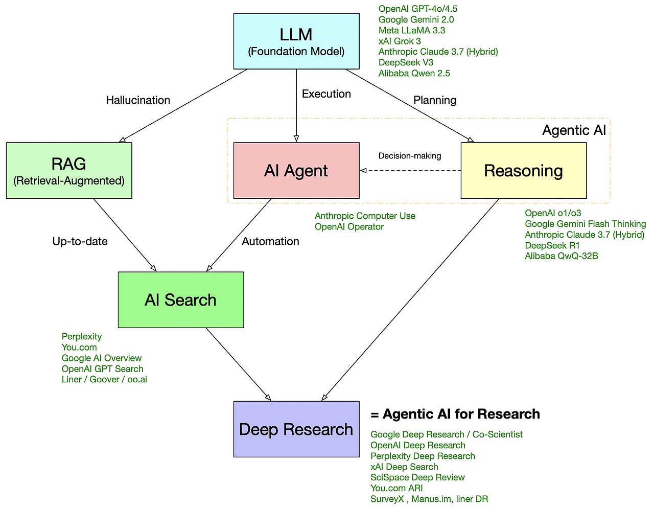 아래 그림에 LLM 파운데이션 모델에서부터 Deep Research에 이르는 기술 진화도를 대략적으로 그렸다.