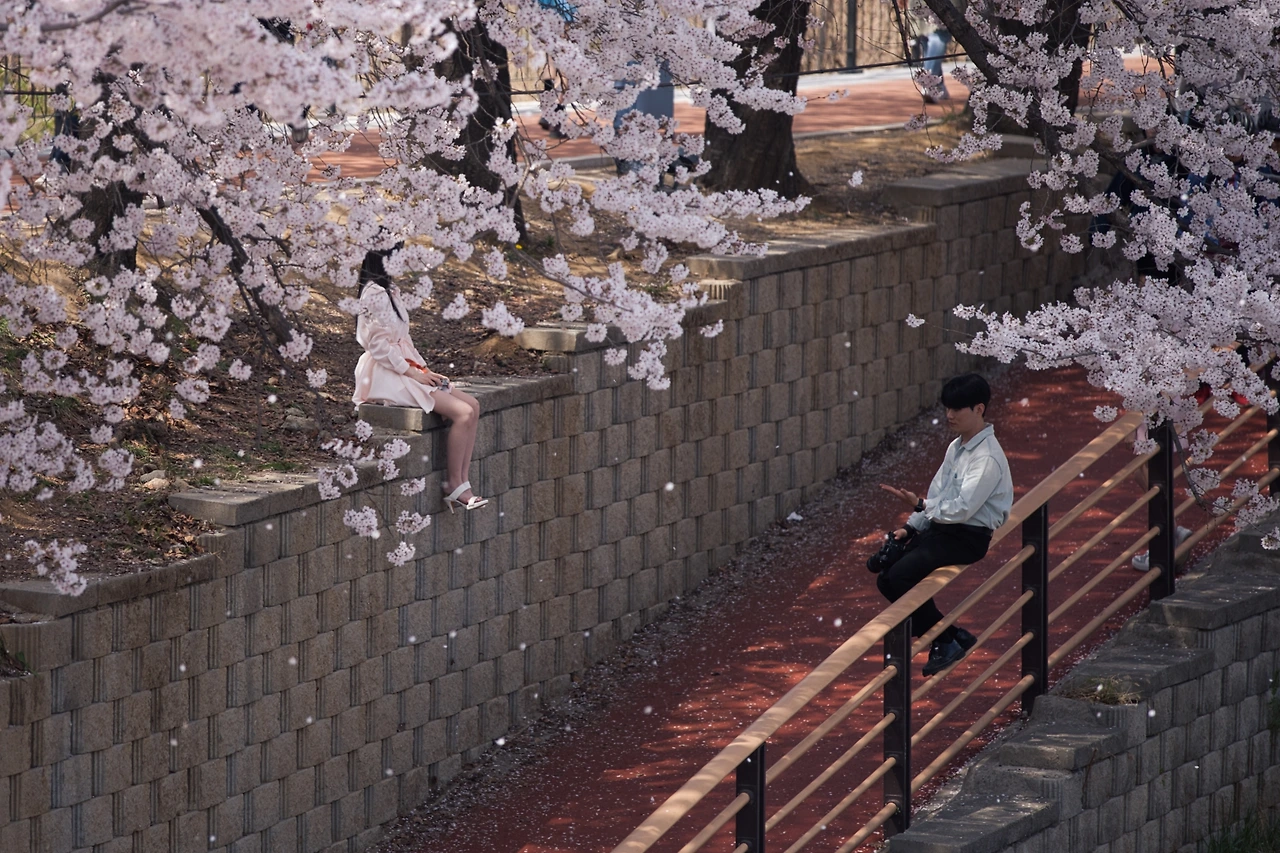 원래는 주말을 보내고 여의도를 가볼 생각이었다. 그런데 주말에 비소식도 있고 여의도는 잠실보다 집에서 더 멀고 또 사람들이 많을 것 같고, 잘은 모르지만 벚꽃 군락의 특별함은 없을 것 같았다. 직접 가보지 않았기에 그냥 그렇게 생각하기로 했다. 대신 비 오기 전에 양재천을 가보기로 급하게 생각을 바꾸고 카메라를 챙겼다. 지난 4년 동안 양재천 인근에 있는 사무실에서 근무했다. 그럼에도 한 번도 양재천의 벚꽃을 제대로 즐기지 못했다. 차를 타고 퇴근할 때마다 양재천의 다리 위에서 사진 찍는 사람들을 보면서 잠시 정차하고 사진을 찍고 싶었다. 그런데 서울에서 잠시 정차하는 게 가능하지 않다. 그런 아쉬움을 가졌던 장소였기에 오히려 지금이 기회다. 양재천도 사람이 많을 거라는 걸 알지만 봄과 꽃은 기다려주지 않는다. 그리고 혼자 다녀서 불가능한 인물 사진을 도촬처럼 찍을 수도 있다. (바람직한 건 아니지만 그냥 개인 욕심이다. 허락되지 않은 인물 사진은 외부에 공개하지 않는다. 유튜브에 있는 스트리트 포토그래퍼들처럼 관광지에 가서 사람들 사진을 찍어주고 전송해 주는 것도 재미있을 텐데, 내가 그걸 하기에는 너무 내성적이다.) 뚝 위로 걸으면 벚꽃을 배경으로 인물 사진을 찍기에 좋다. 그래서 연인끼리라면 석촌호수보단 양재천을 더 추천한다. 물론 장소마다 특별함은 다르겠지만...