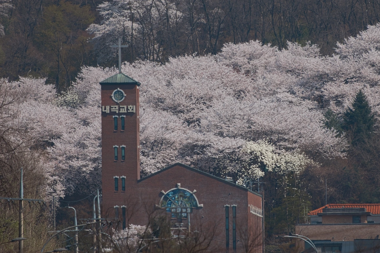 양재천으로 가는 버스에서 옛 기억이 떠올랐다. 4년 전 어느 봄날에 늦은 오후에 퇴근하는데 내곡교회 뒤로 벚꽃이 활짝 핀 것을 봤다. '이건 사진으로 남겨야 돼'라는 생각이 들었다. 교회 100m 정도 앞에 헌릉로를 가로지르는 육교가 있'었'다. 적당히 근처에 주차를 하고 육교 위에서 사진을 찍으면 괜찮을 거라고 계획하고 1년을 기다렸다. 그런데 겨우내 중앙버스차로 공사를 하더니 벚꽃 피기 직전인 3월 어느 날 육교를 철거한 것을 봤다. OTL. 1년의 기다림이 무의로 돌아갔다. 퇴근할 때마다 내곡교회를 보면서 매번 아쉬움이 남았는데, 원래 육교에서 사진을 찍지는 못하더라도 그냥 도로변에서 찍으면 비슷한 사진은 남길 수 있지 않을까?라고 생각했다. 그래서 양재천에서 무턱대로 내곡교회 인근까지 걸어와서 조금 아쉬운 사진을 남긴다.