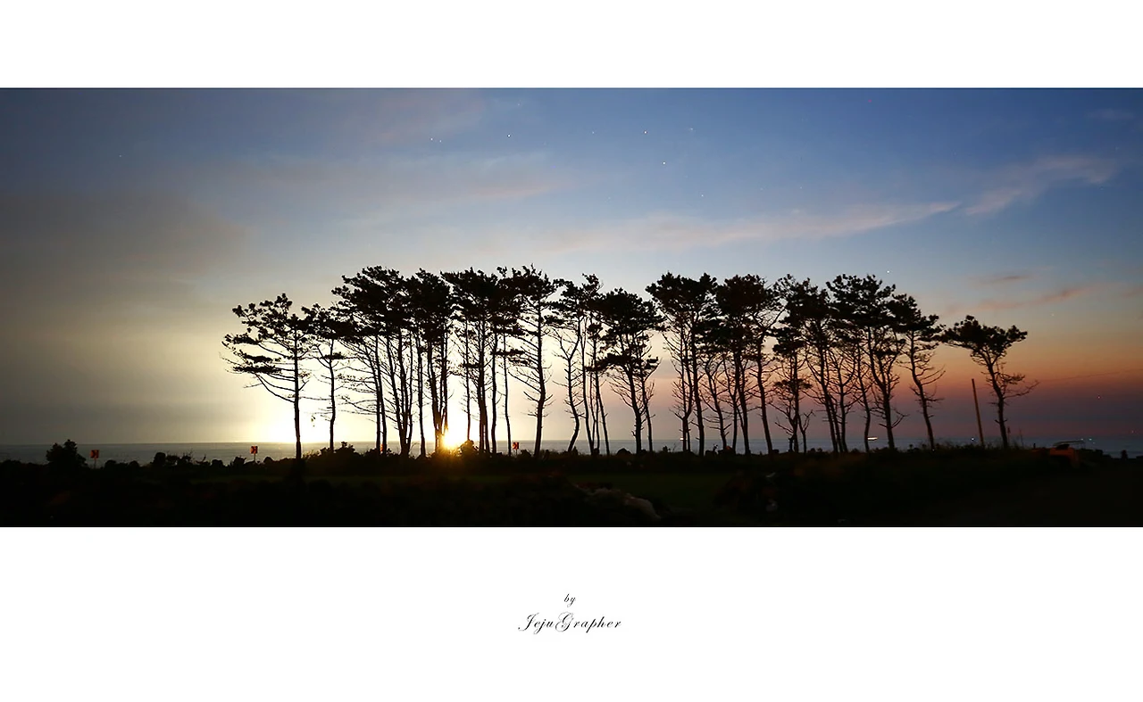 첫번째 장소는 한림항에서 동쪽으로 해안도로를 따라서 조금만 (차로 2~3분)이동하면 소나무숲이 있습니다. 조금은 엉성하지만 한 무리의 소나무들과 뒤로 탁 트인 공간이 솔섬과 꽤 닮았다고 생각했습니다. 단지 아쉬운 점이라면 앞으로 호수/물이 없어서 물에 반영된 사진을 찍지 못한다는 점입니다. 혹시 나중에 비가 온 후에 밭에 물이 고였을 때 운이 좋으면 비슷한 이미지를 얻을 수 있을지도 모르겠습니다.