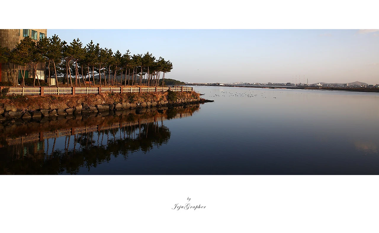 성산 시내 쪽에 성산포를 건너는 다리가 하나 있습니다. 그곳에서 찍은 사진입니다. 줄지어선 소나무가 있고 또 호수에 소나무가 반영됩니다. 아쉽게도 뒤에 건물만 없었다면 솔섬과 비슷해 보일 것같습니다. 소나무가 조경수로 임의로 심은 것같기도 하지만... 대신 고개를 오른쪽으로 돌리면 성산포에 반영된 성산일출봉을 볼 수 있습니다. (사진은 생략)