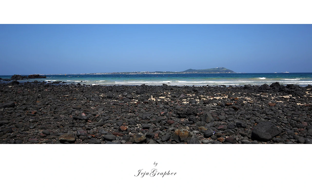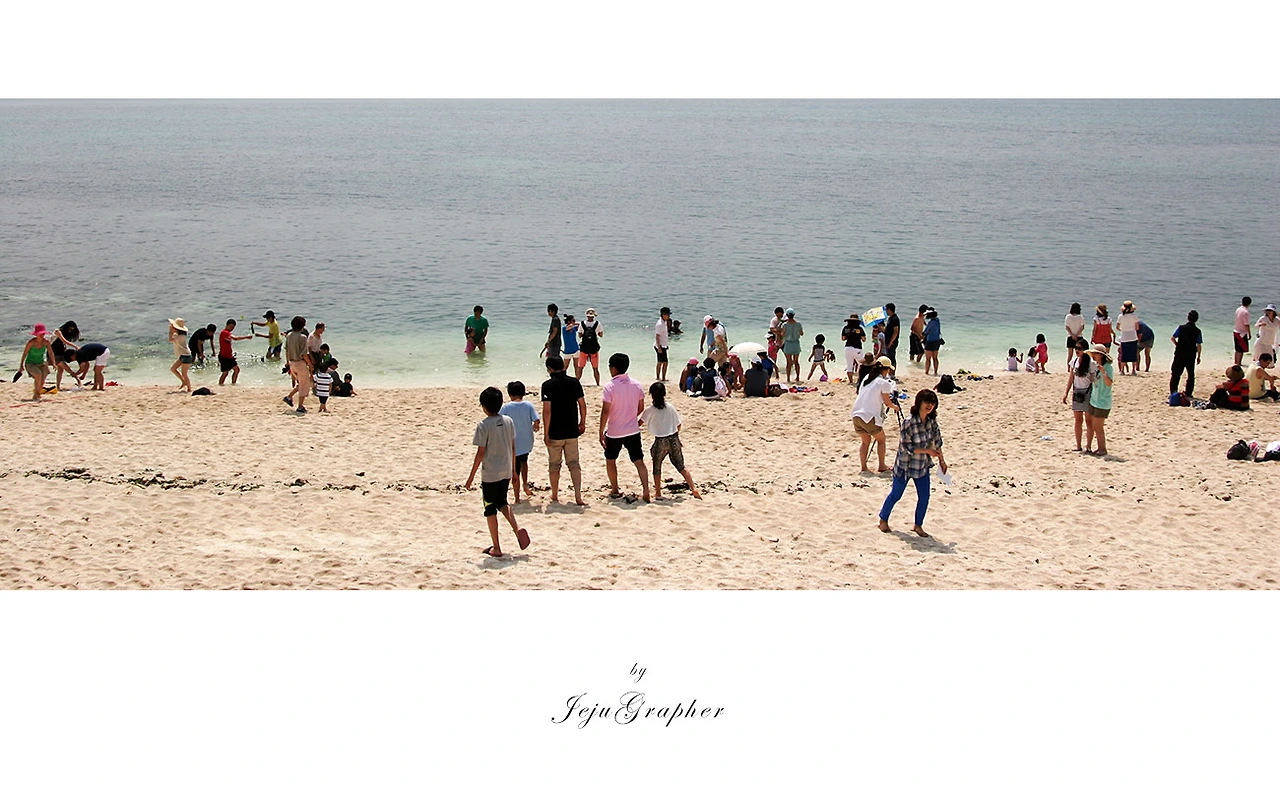 우도의 자랑거리는 역시 죽은 산호 조각으로 형성된 서빈백사입니다. 그런데 2000년도에는 서빈백사가 진짜 흰색이었던 걸로 기억되는데, 지금은 희색보다는 그저 누른 모래사장 같은 느낌입니다. 바다 건너 지미봉이 함께 보이는 게 더 아름다운데, 그렇게 크롭 하면 사람들이 잘려나와서 그냥 해변과 바다 위주로 크롭 했습니다.