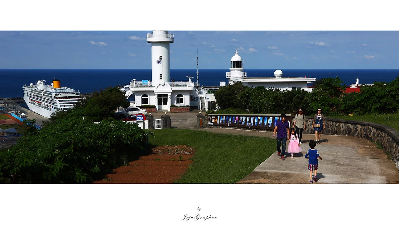 이곳이 산지등대입니다. 낮시간 동안 일반에 공개 돼있어서 여행객들이 등대 옥상에 올라 먼 바다도 바라보고 제주항에 입출항하는 배들도 볼 수 있습니다. 요즘은 중국 관광객들을 실은 대형 크루즈 선박이 빈번히 정박해서 이런 큰 배들이 입출항하는 모습을 보는 것도 이색적이라면 이색적인 풍경입니다. 사진에서 보듯이 등대 입구에 대한민국의 아름다운 등대 16곳(?)의 사진도 감상할 수 있습니다. 분명 이 포스팅의 주인공은 산지등대지만, 사진을 크롭하면서 아이의 다리를 자를 수 없어서 등대의 목을 잘라버렸습니다.