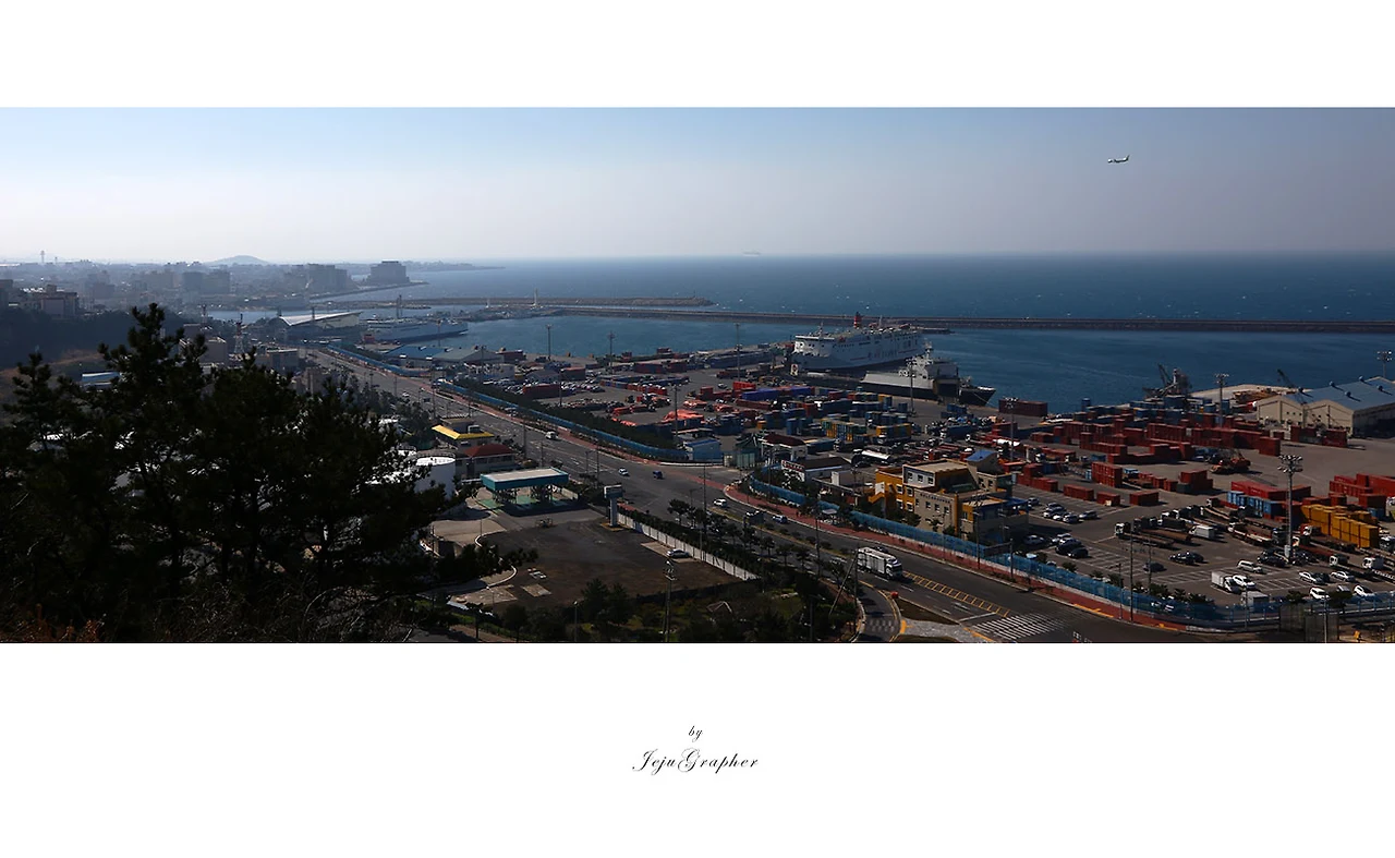 서쪽으로 제주항의 전경을 볼 수 있습니다. 사진에서처럼 공항에 이착륙하는 비행기를 보는 것은 덤입니다.