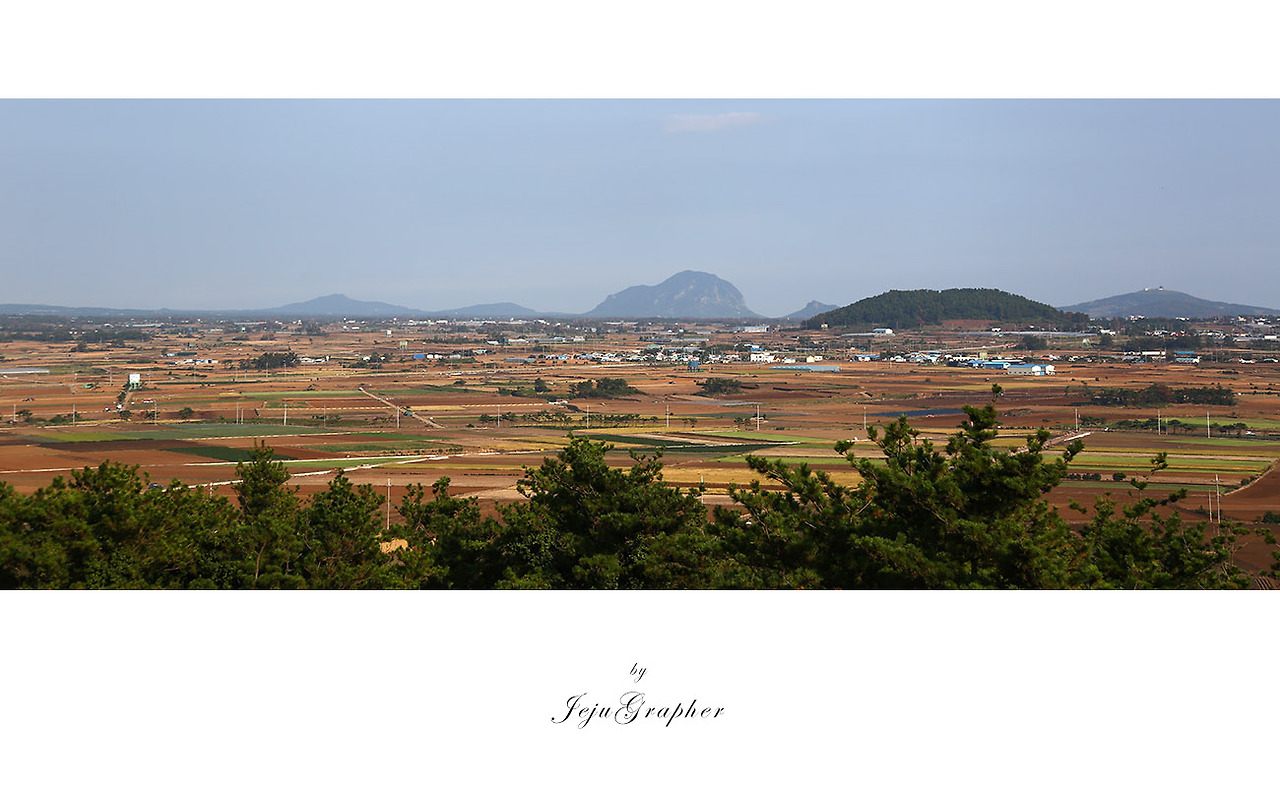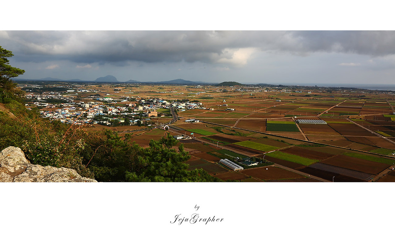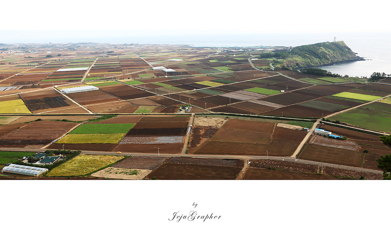 원래 수월봉을 찾아갔다가 그냥 집으로 돌아가던 길이었습니다. 수월봉 정상 (차를 타고 갈 수 있음)에서 가을걷이가 끝나고 겨울 파종이 시작되는 이 시기에 여러 색으로 물든 밭의 색에 매료됐습니다. 그런데 앞쪽으로 전신주와 전선이 어지럽게 있어서 사진을 찍기에는 별로였습니다. 그래서 실망하며 돌아오는 길에 바로 옆에 있는 당산봉이라는 곳을 계획 없이 올랐습니다. 다행히 당산봉에서는 아래로 밭의 전경을 온전히 볼 수 있었습니다. 이후로 이 모습을 보기 위해서 몇 차례 더 찾았습니다. 위의 사진에서 보듯이 제주의 봄과 가을에는 파종과 결실이 함께 이뤄지는 계절입니다. 그래서 아직 식물이 자라고 있는 밭도 있고, 봄/가을걷이가 끝난 곳도 있고, 또 새로 파종을 했거나 파종을 위해서 밭을 갈아둔 곳, 그리고 휴지기의 밭도 있습니다. 화산석이 부서져서 형성된 제주의 흙은 검은색이고, 여기에 누른 황토까지 더했습니다. 그래서 위에서 내려다보면 알록달록합니다.