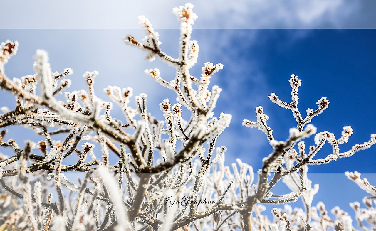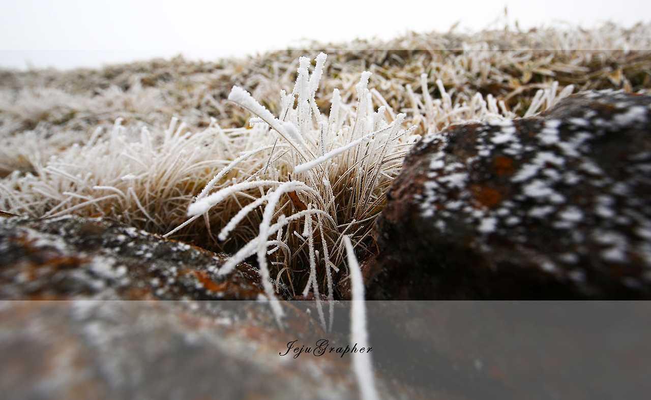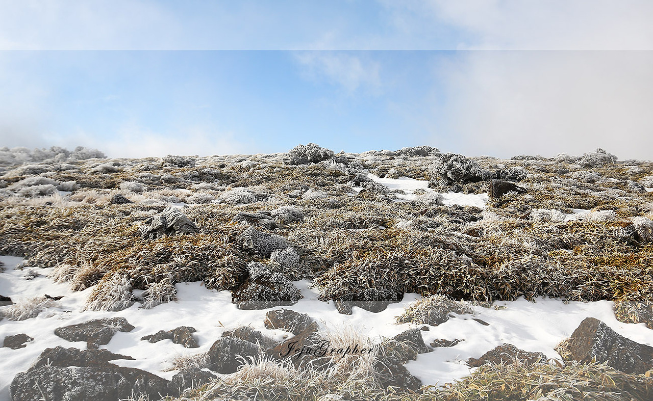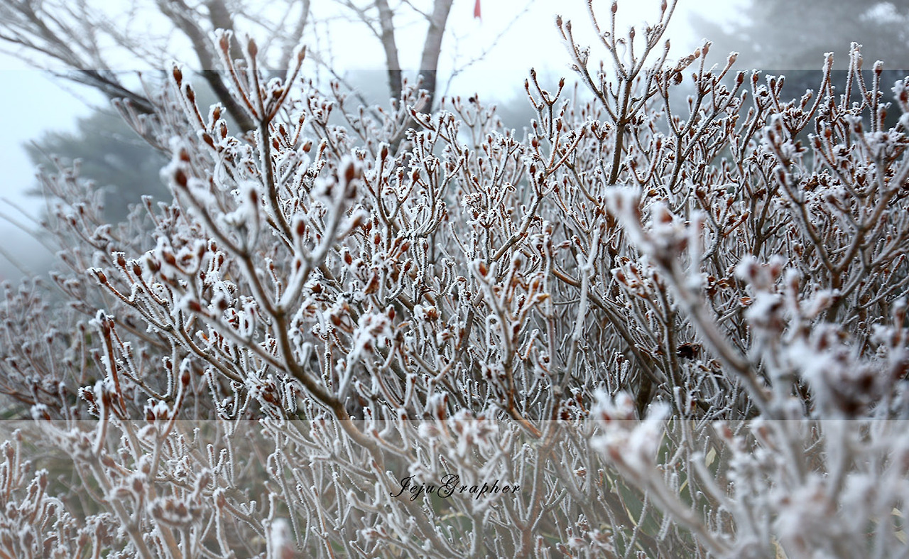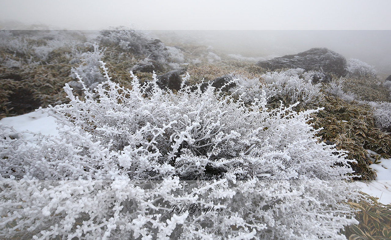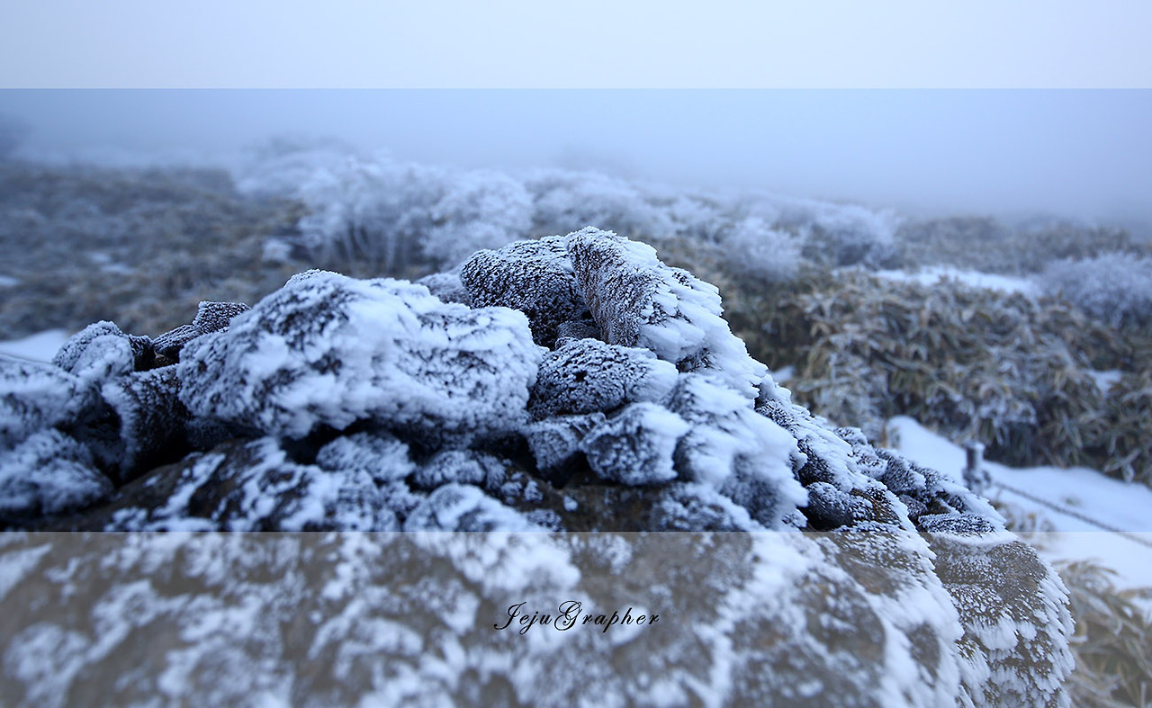 지난 주말, 아니 크리스마스 새벽에 윗세오름에 올랐습니다. 제주도에서 겨울이 기다려지는 이유는 눈 덮인 겨울산을 오를 수 있기 때문입니다. 그런데 이번 겨울은 예년과 많이 다릅니다. 기온이 평소보다 다소 높아서 눈도 많이 내리지 않았고, 눈이 내렸더라도 주말을 기다리는 동안 모두 녹아버립니다. 정상에서 아무도 밟지 않은 눈밭을 거닐면 무릎 또는 허벅지까지 다리가 빠졌는데, 운 좋게 대설 다음날 산행을 한다면 모를까 올해는 그런 경험을 할 수 없습니다. 그래도 정상에는 기온이 낮기 때문에 안개/구름이 바로 나뭇가지에 결빙돼서 멋진 눈꽃을 감상할 수 있습니다. 그러나 안개로 가시거리가 짧아서 확 펼쳐진 눈밭은 볼 수가 없습니다. 그렇기에 가끔 빠른 구름이 지나면서 푸른 하늘이 살포시 보일 때의 경치는 끝내줍니다.