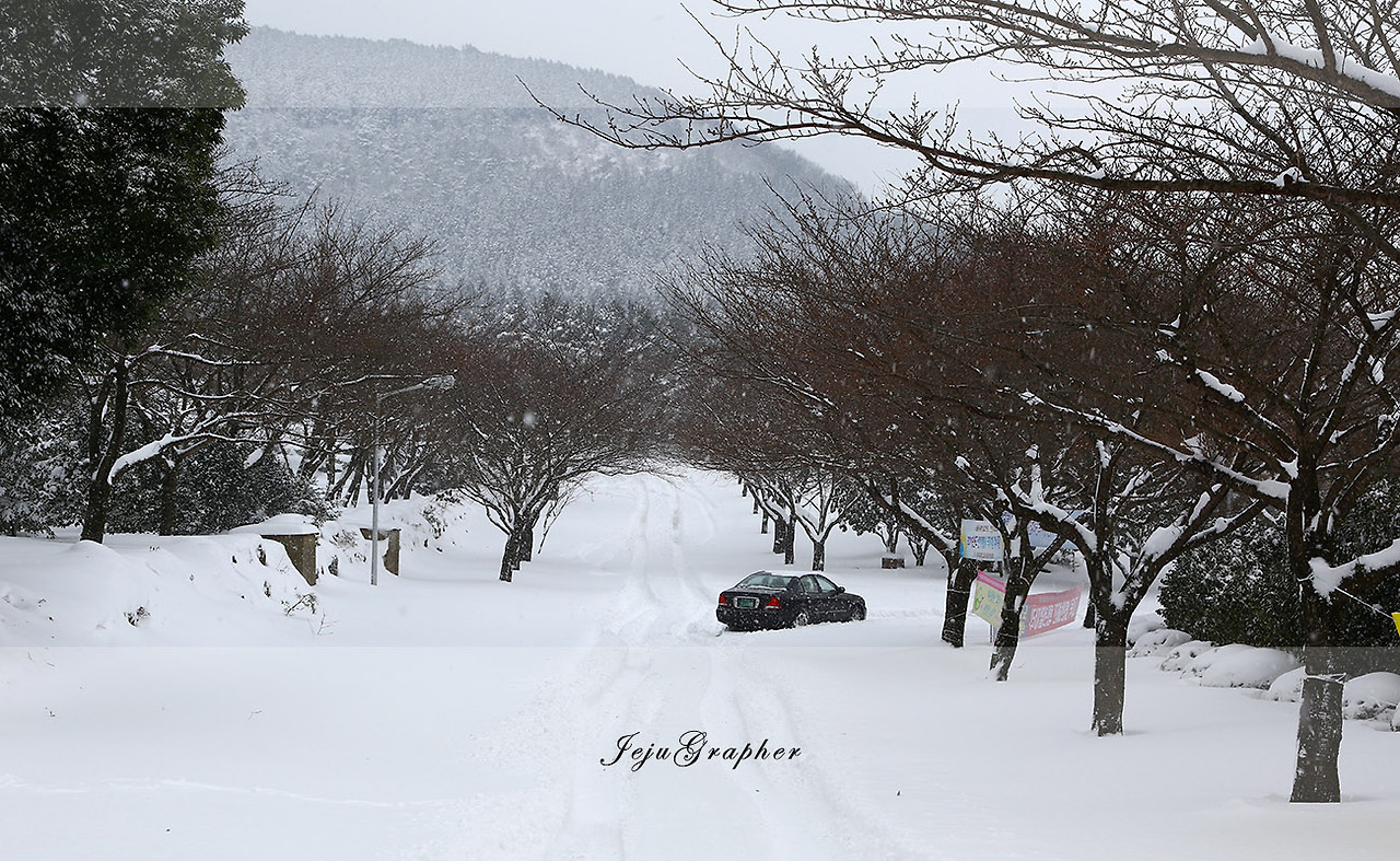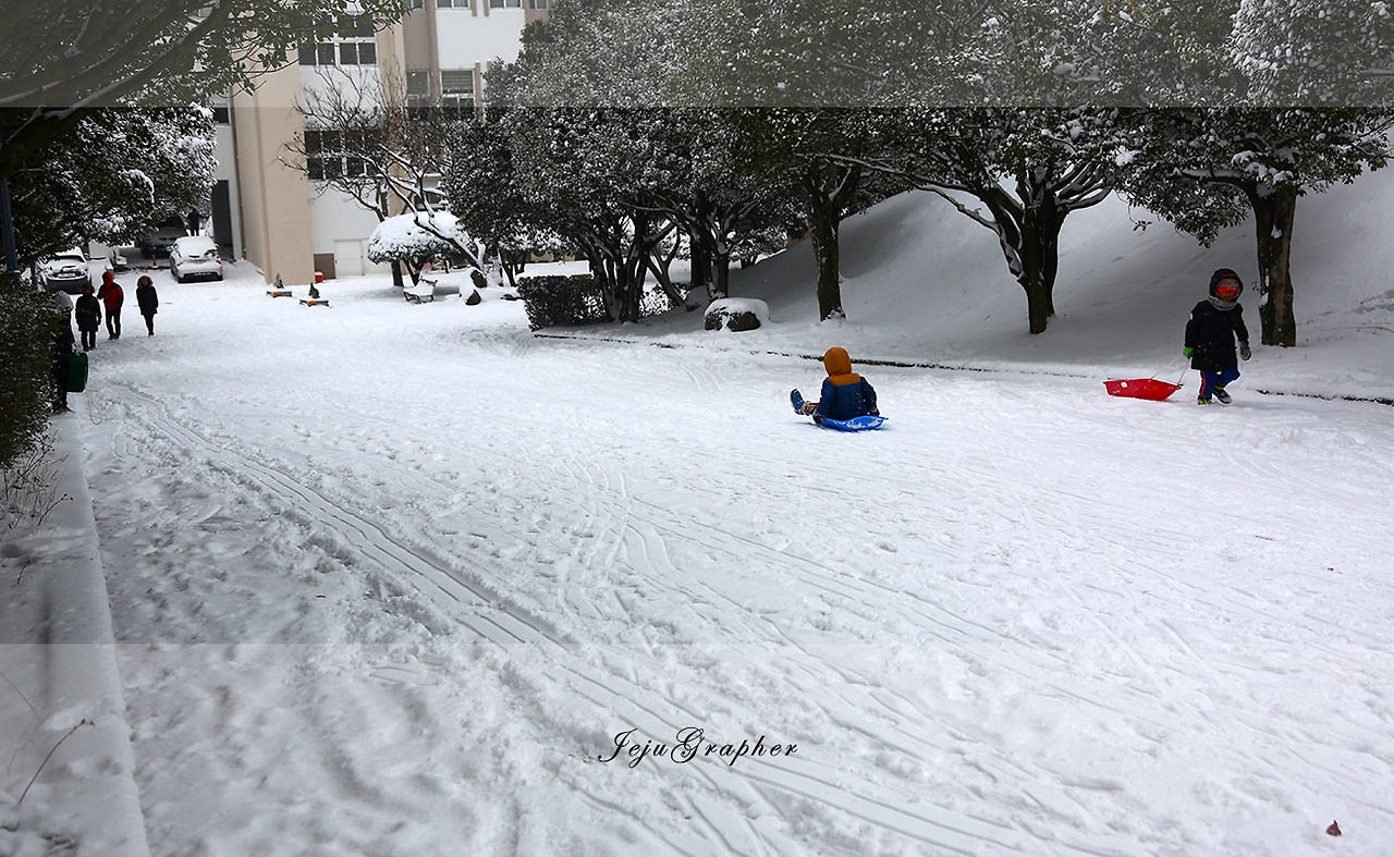 제주에서 아쉬운 것 하나는 스키장이 없다는 점이다. 그래서 이렇게 눈이 오면 눈썰매를 즐긴다. 아이가 있는 집이라면 자동차 트렁크에 눈썰매 한두 개 정도는 모두 가지고 있다. 보통 제주 마방목지, 왕벚꽃 자생지, 과학고 옆, 그리고 어리목 입구에서 눈썰매를 많이 탄다. 제주대학교도 좋은 장소지만 앞서 말한 곳보다 지대가 낮아서 눈이 더 빨리 녹아버린다. 이렇게 눈 쌓인 날이면 스노우 타이어와 체인을 잘 갖춘 SUV로만 이동하는 게 안전하다. 그렇지 않다면 그냥 집에서 편하게... 월동 준비가 잘 된 차가 있었다면 더 멋진 곳으로 돌아다녔을 텐데... 이렇게 하루가 끝났다.