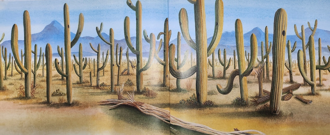 새들의 보금자리만큼 단단해진 선인장에 도마뱀 무늬 딱따구리가 열매를 먹으러 왔다가 자리를 잡았습니다. 안전하고 먹이가 많은 선인장에 동물들이 하나둘씩 모여들었습니다. 선인장 호텔이 들어섰습니다. 새들은 알을 낳았고, 사막쥐는 새끼를 길렀습니다. 모두 선인장에 깃들어 살았습니다.