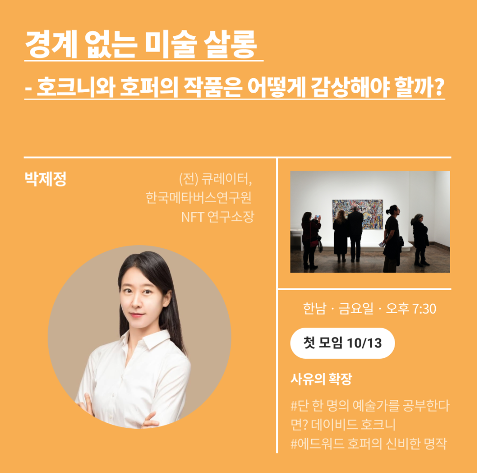 넷플연가에서 진행하는 <경계 없는 미술 살롱>은 새로운 시각을 발견하고 예술의 매력을 더 많은 사람들과 나누고 싶은 분들이 함께하셨으면 좋겠습니다.