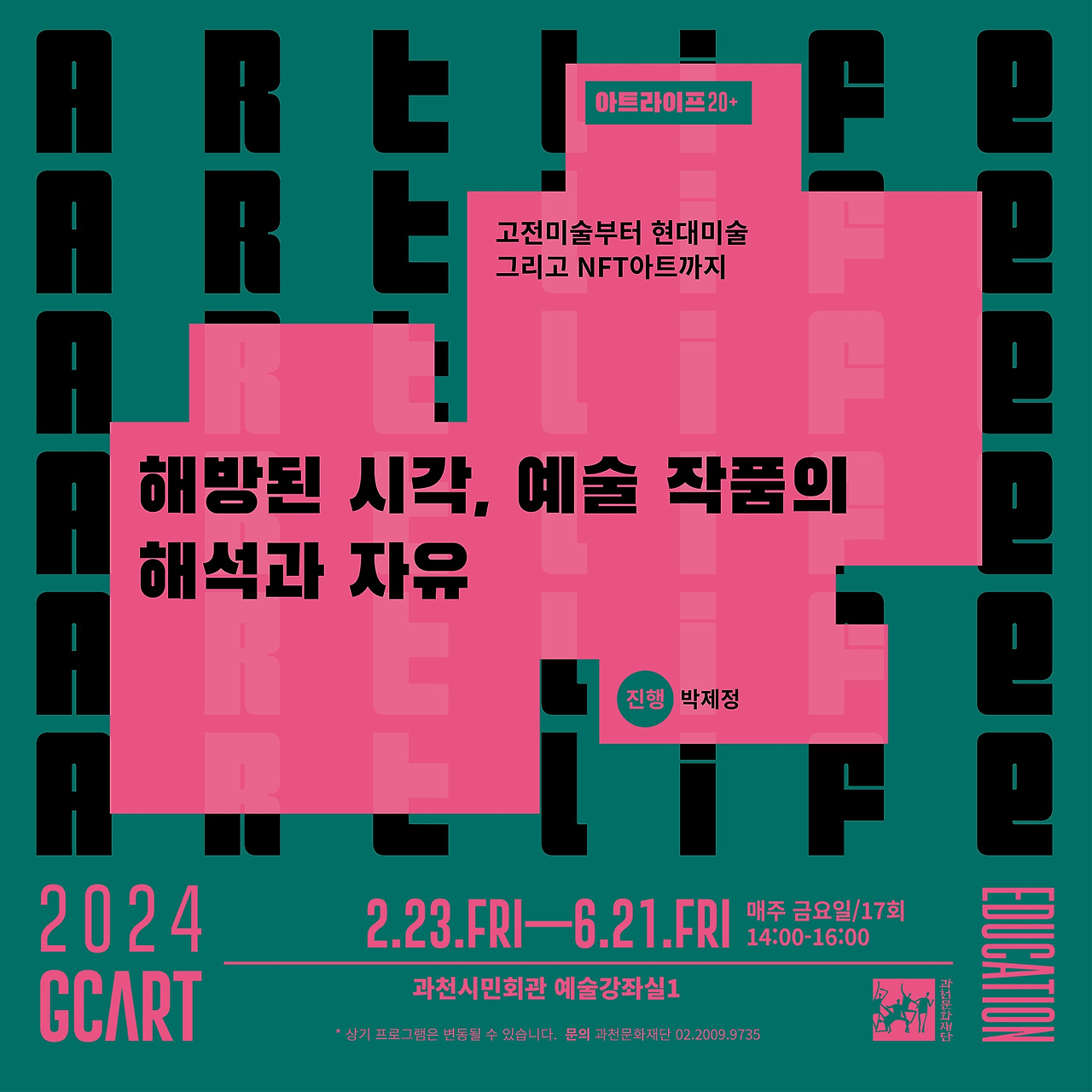 좋은 기회가 닿아 과천문화재단에서 <고전미술부터 현대미술 그리고 NFT아트까지> 강의를 진행하게 되었습니다. 이번 강의 주제는 “해방된 시각, 예술 작품의 해석과 자유”로 예술 해석의 자유를 향한 여정으로 여러분을 안내합니다. 고전미술부터 현대미술 그리고 NFT아트까지 시대를 넘나들며 예술 작품을 보다 자유롭게 감상하고 해석할 수 있는 기회를 제공합니다. 일방적으로 작품 해석을 하거나 지식과 이론 중심의 건조한 설명이 아니라 스스로 미술을 감상하는 즐거움을 가질 수 있도록 방향을 제시하는 열린 강의입니다.