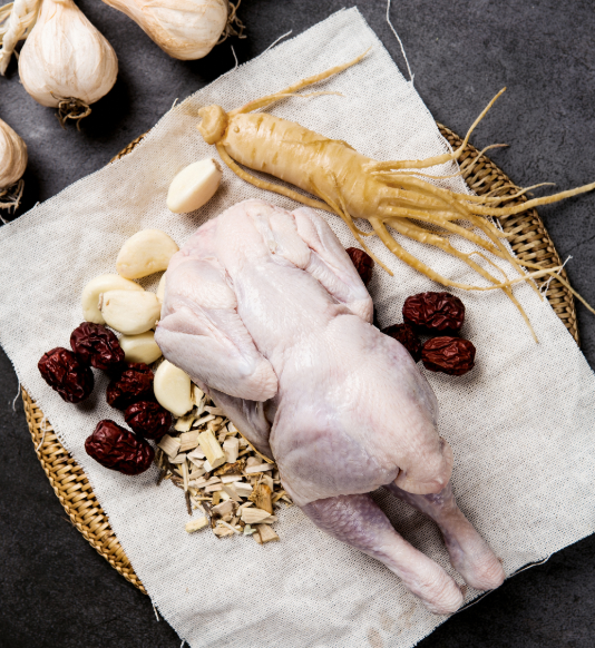 손질된 닭, 대추, 은행, 통마늘, 티백 등