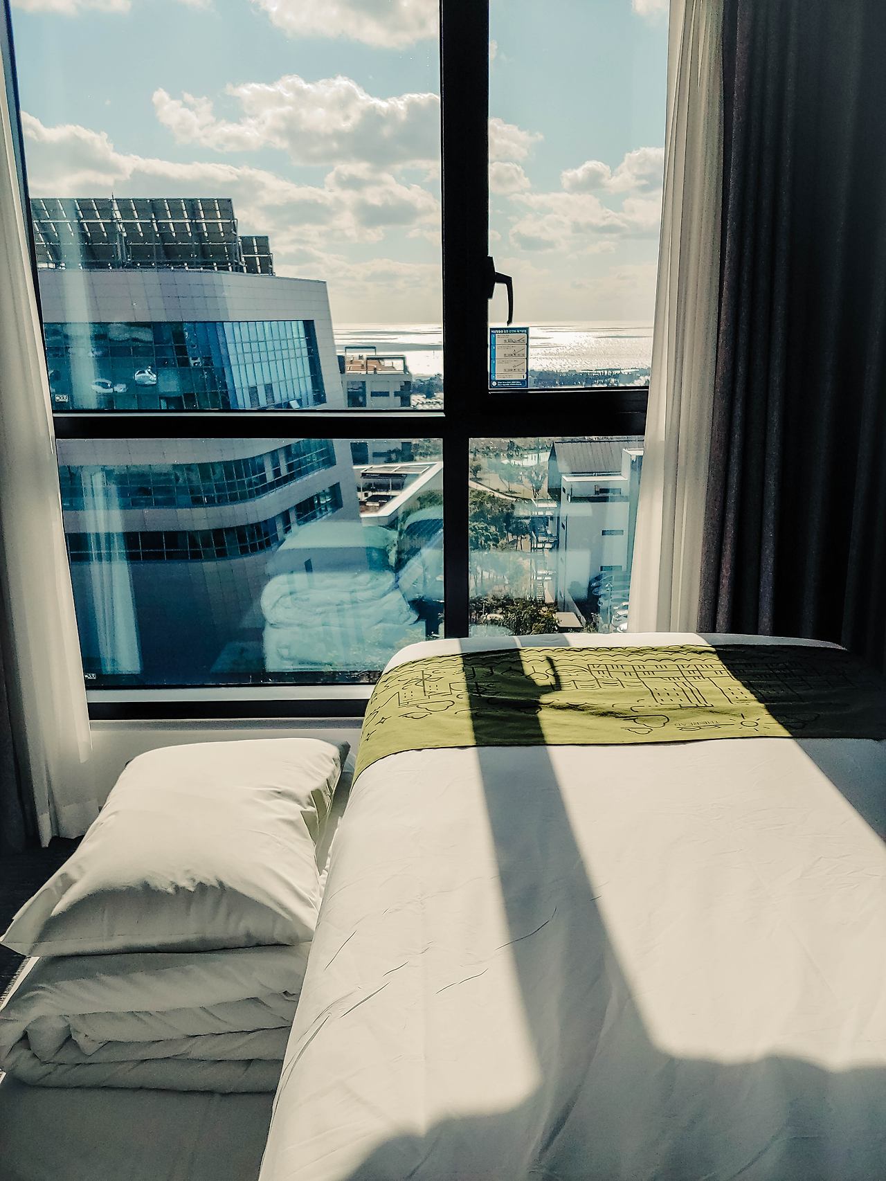 객실의 침대는 작업 공관으로 이용할 수 있는 테이블로도 사용할 수 있죠. 노트북과 책 몇 권을 올리면 이내 꽉 채워져버리고 말지만, 잠시나마 제주에서 바다가 보이는 나만의 사무실을 가질 수 있다는 것은 생각만으로도 너무 낭만적이지 않나요?