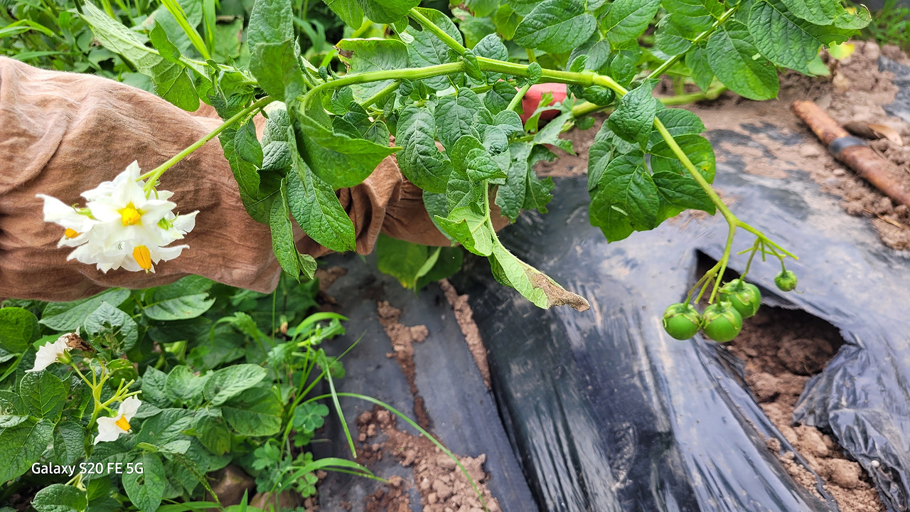 감자 밭이다. 먼저 핀 꽃들은 따주기 작업을 했다. 나중에 핀 꽃들은 아직도 피어 있다. 그런데 꽃이 피어 있는 감자에 웬 열매가 매달려 있다. 처음 보는 열매다. 하긴 처음 감자를 심었으니 처음 일 수밖에 없다.