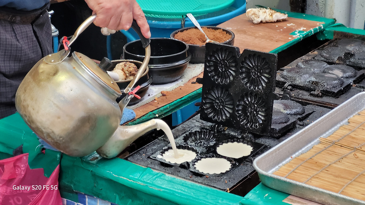 국화빵을 굽는 데는 시간이 좀 걸렸다. 사려는 사람은 여럿이다. 당연히 줄을 서야 한다. 국화빵 아저씨는 세월아 네월아 천천히 빵을 굽고 있다. 옆에서 보는 내가 답답할 지경이다. 보아하니 지나가는 관광객들이 심심풀이로 들리는 코너인 모양이다. 요새 붕어빵 가게는 많지만 국화빵, 풀빵 가게는 보기가 힘들다.