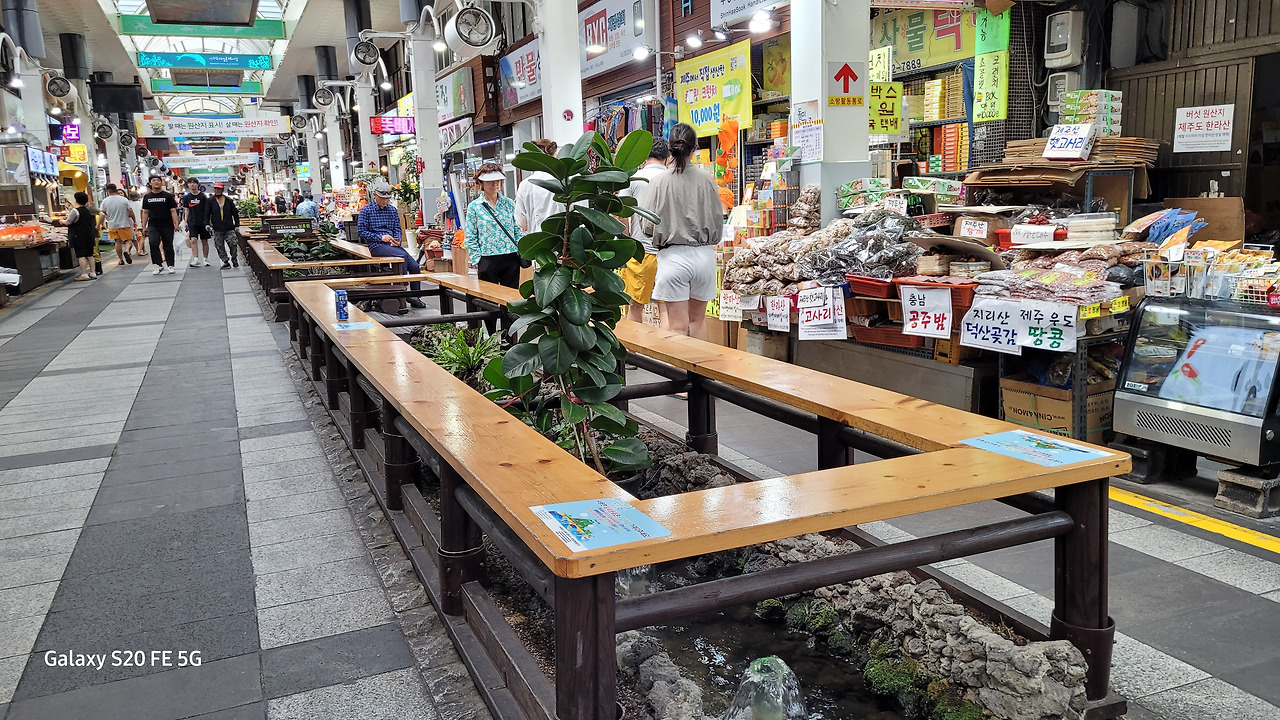 매일올래시장은 마치 생태공원같이 구성을 해놓았다. 길 가운데 졸졸졸 물이 흐르는 개울과 그 위에 걸터 앉을 벤치를 만들어놨다. 우리는 그 위에 걸터앉아서 커피를 마시면서 이런저런 얘기를 했다. 오늘은 평일이어서 그런지 시장이 한가하다. 우리 마음도 한가했다.