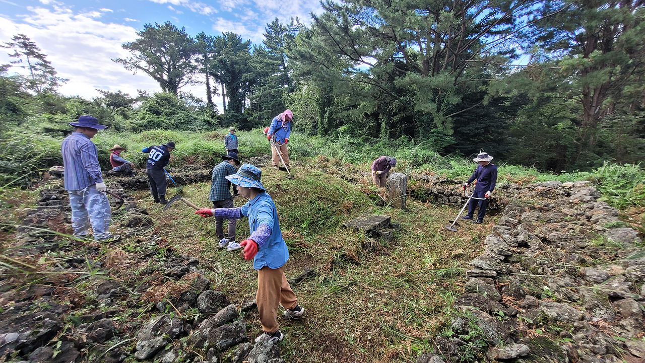 9월 제주의 중산간지역 산야나 목장, 오름은 벌초객으로 붐빈다.
