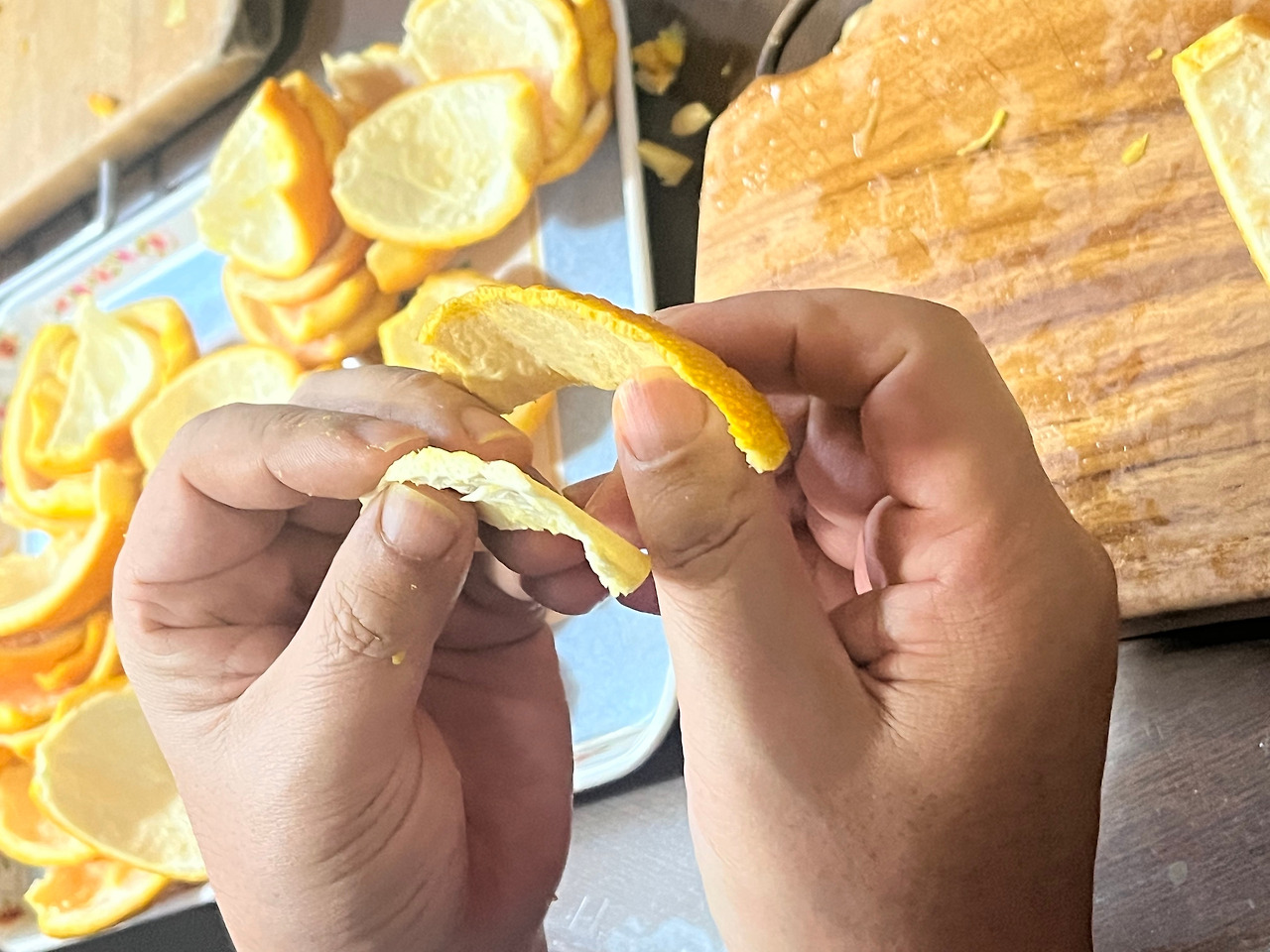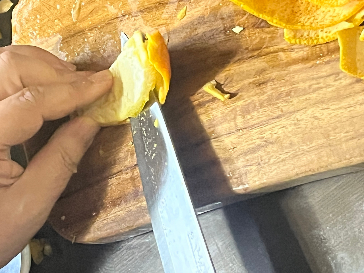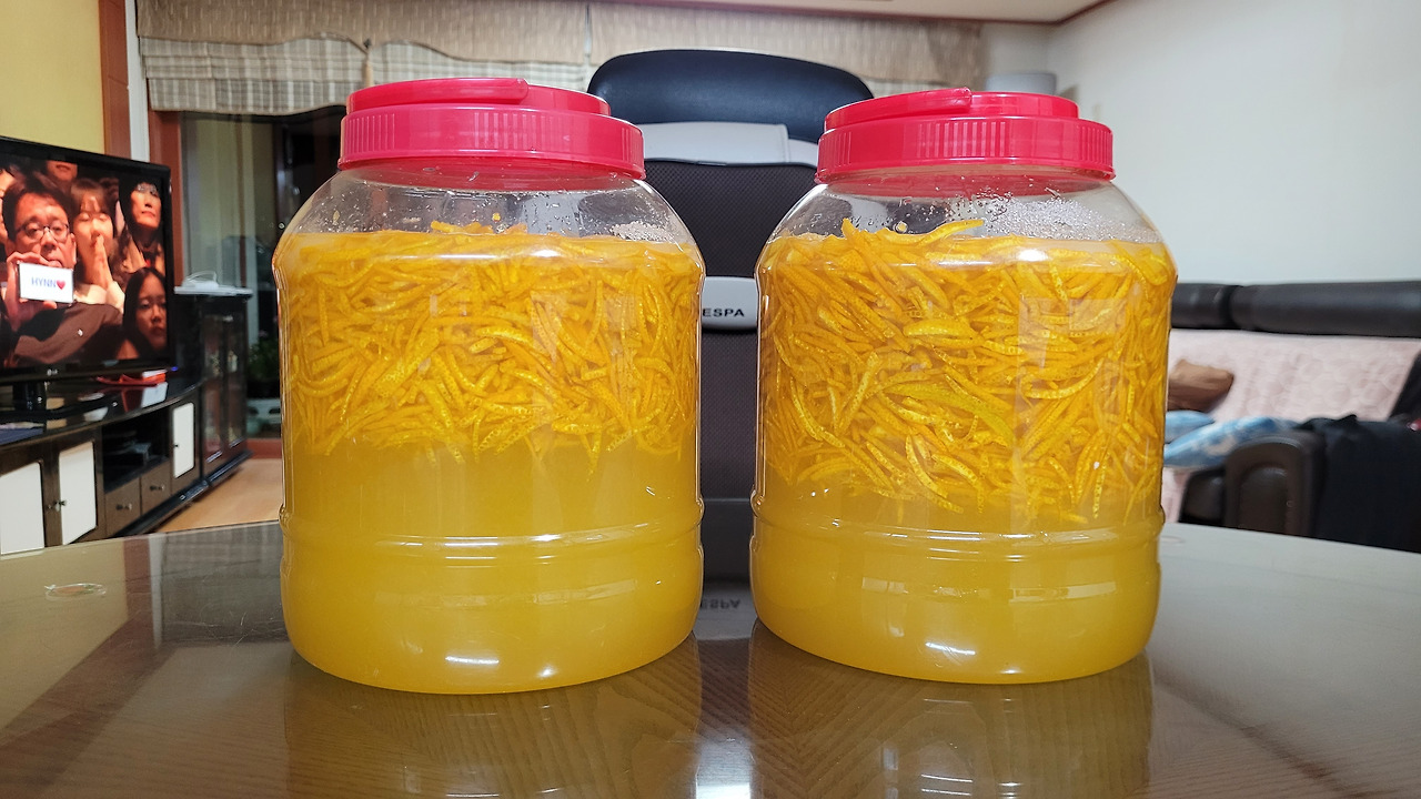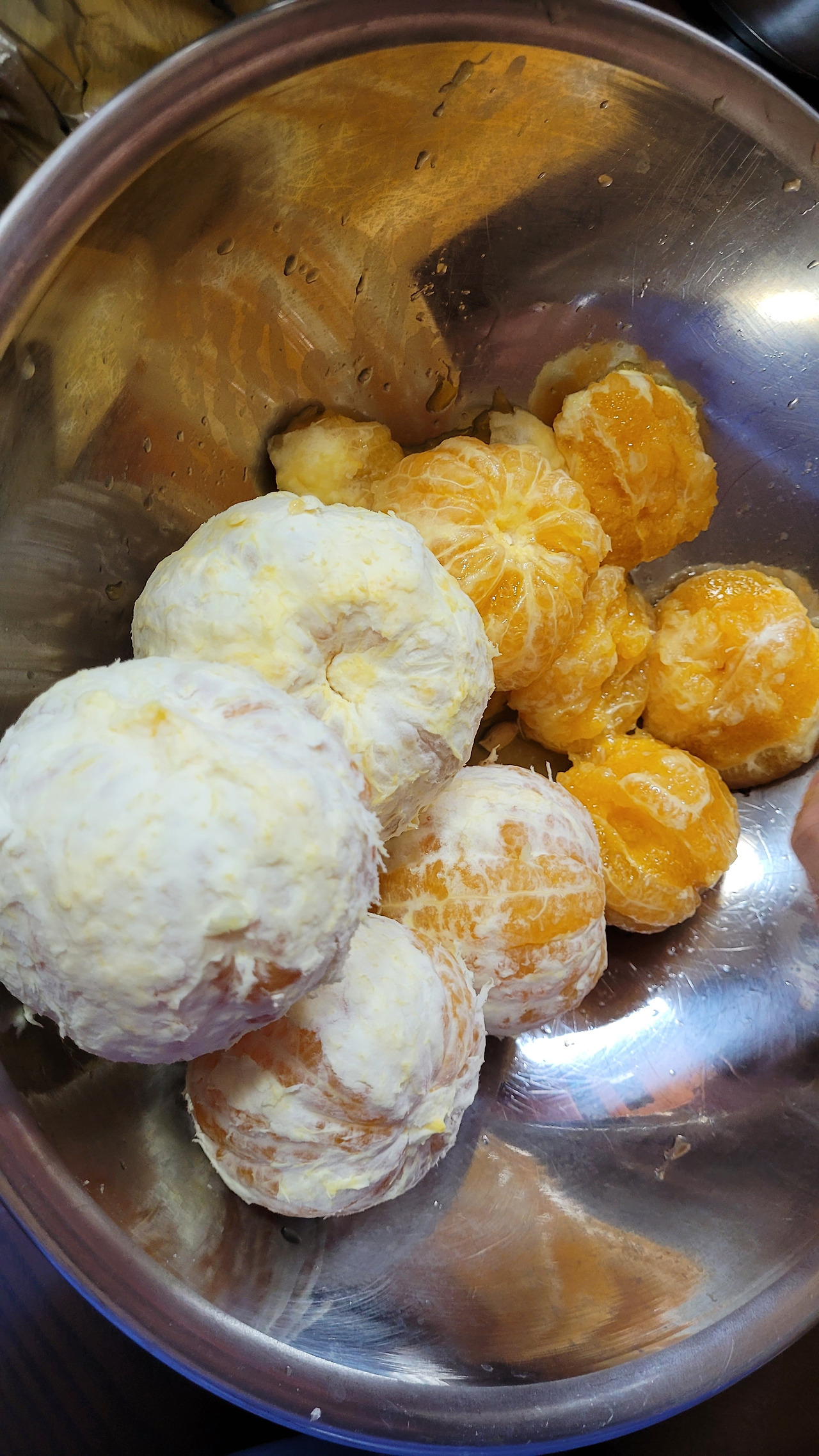 - 귤 겉껍질 안쪽에 그물 모양으로 생긴 하얀 섬유질을 뜻하는 말로, 정확한 명칭은 '알베도층'이다. 식이섬유, 비타민 C와 항균·항바이러스 작용을 하는 비타민 P가 풍부하게 함유되어 있어 모세혈관을 튼튼하게 하고 몸에 해로운 산화작용을 억제하는 데 도움을 준다. 한의학에서는 독소 배출과 소화 불량 해소 효과가 있다고 보아 약재로 쓰거나 차로 달여 마신다.