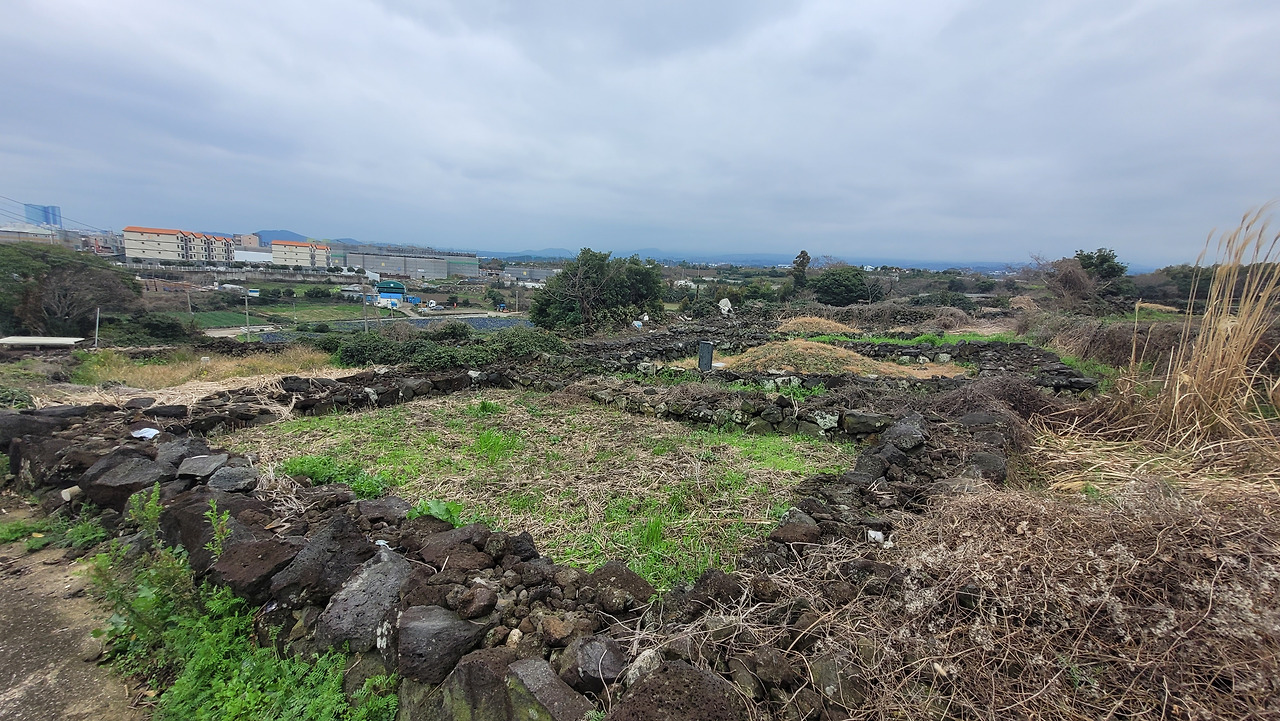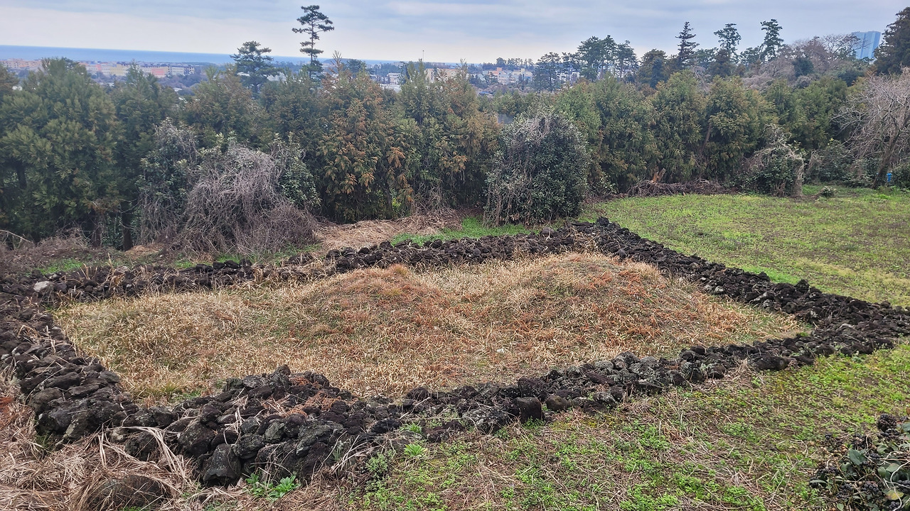 제주에서는 예전에 사람이 죽으면 밭의 한구석에 무덤을 만들었다. 그리곤 우마들이 드나들지 못하도록 담을 둘렀는데 이게 산담이다. 지금도 이런 산소는 여기저기서 흔히 볼 수 있다.