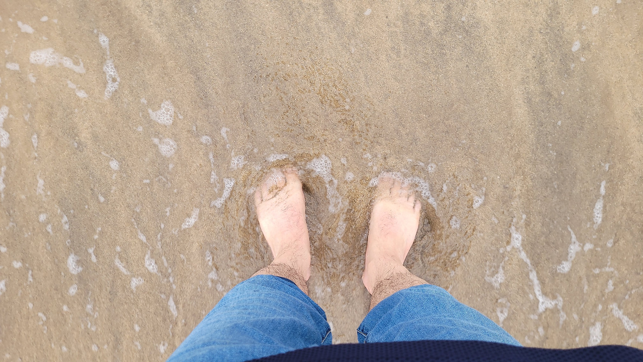 나도 어느덧 신발을 벗고 양말을 신발 속에 담고 있었다. 신발이 빠질 염려가 없으니 성큼성큼 모래밭을 걸어서 물가로 갔다. 바닷가를 걷고 있는 사람들 무리 속에 끼어들었다. 지그재그로 걸면서 이따금 들어오는 바닷물에 발을 담그기도 했다. 오랜만의 경험이다. 어릴 적 바닷가에서 친구들과 장난을 치던 추억이 생각났다. 걷는 사람들은 남녀노소, 심지어는 외국인까지 있다. 해안선의 길이는 500여m를 조금 넘는다. 다가오는 물길을 발길로 차면서 멍하니 걷다보니 어느새 해수욕장 끝지점에 다다랐다. 발바닥에 묻어 있는 모래를 털면서 방파제로 올라왔다. 다음 주에는 방파제에도 맨발 걷기를 위한 코스를 만들 예정이라고 옆에서 귀뜸해준다.