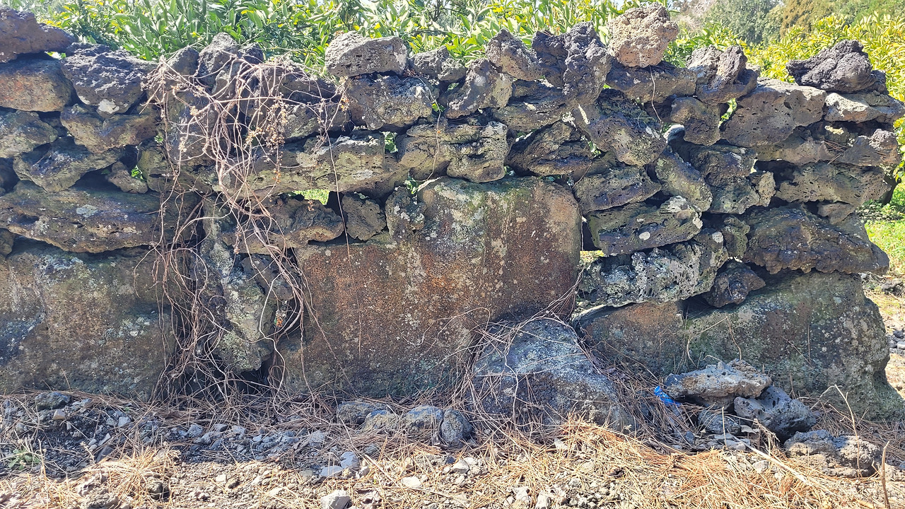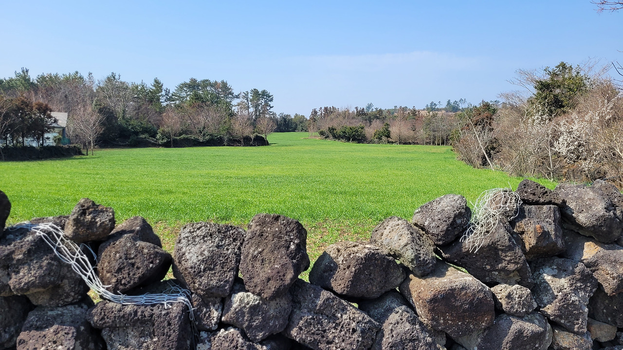 시간상 10,000보를 걷는 선에서 돌아오기로 했다. 곶자왈의 특성이 다 비슷한 모양이라 다소 지루함도 잇는 듯하다. 우리는 곶자왈 중간에서 다시 마을로 향했다. 내려오는 길 아직도 수확을 포기한 듯한 감귤들이 보인다. 밭담들이 다른 곳 하고는 좀 다르다. 울퉁불퉁함이 더 날카롭고, 작고, 못생겼다. 이런 돌들의 면을 맞춰서 무너지지 않을 밭담으로 쌓았다는 게 신기할 정도다. 좀 더 걸으니 돌담안 파란 보리밭이 나온다.