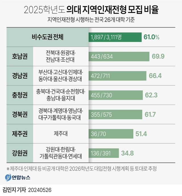 의대 정원이 대폭 확대되면서 지방거점대학에서는 반드시 그 지역 출신 학생을 일정 비율 의무적으로 선발하도록 하고 있다. 지역인재전형이다. 지역인재전형은 해당 지역에서 고등학교를 나온 학생만 그 지역 의대에 지원할 수 있도록 한 제도로, 일부 대학은 전체 정원의 80%를 지역인재전형으로 선발할 예정이다. 2028학년도 대입부터는 중학교도 그 지역에서 나오도록 요건이 강화된다. 지금은 의정 갈등으로 제도의 정착이 불안정한 상태다. 만약에 원만한 해결이 이루어지고 제도화가 된다면 지방 유학 시대가 열릴 것이라고 예상 하고 있다. 의대를 가고 싶으나 서울에서 합격 가능성이 적은 학생들의 지역인재 선발을 노린 지역 이주 바람이다. 수도권 인근의 지방에서는 벌써 전학을 문의하고 이사할 집을 찾는 문의들이 많다고 한다.