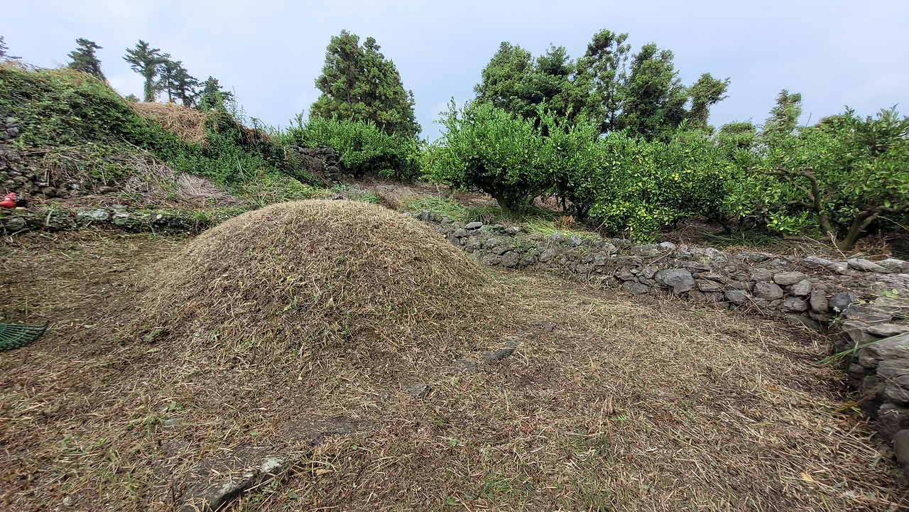 오름이라 가는 길이 험할 뿐만 아니라 하나는 그늘 하나 없는 오름 꼭대기, 하나는 방목지 오름 허리 소나무 숲에 있어서 벌초하는 일이 만만치 않다. 수십 년 전 묘를 쓸 때 환경하고 지금의 환경이 많이 달라져서 매번 갈 때마다 산소를 제대로 찾아내는 게 선결 과제다. 2개의 오름 선산을 벌초하는 게 다른 선산 5~6개의 벌초를 하는 것 이상의 고생길이다. 오름 벌초가 끝나면 올해 벌초는 반 다 했구나 하고 중간 결산을 할 정도다.