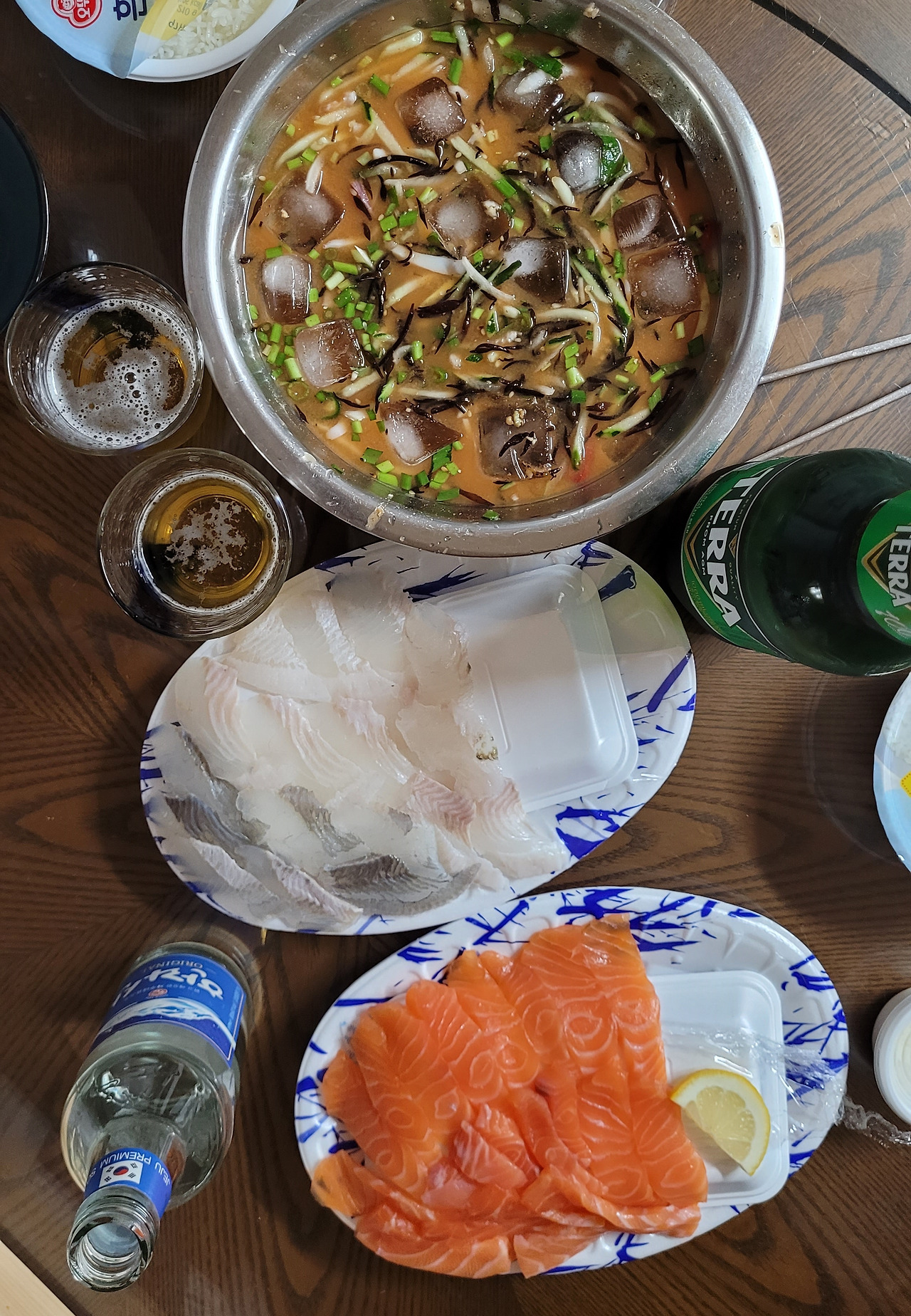 땀을 많이 흘려서 그런지 왠지 시원한 물회가 당기길래 한치물회를 카터에 담았다. 메인 메뉴인 초밥이 없으니 대타인 생선회를 살 생각으로 동네슈펴에 들렸다. 아내와 내가 각각 좋아하는 생선회를 샀다.