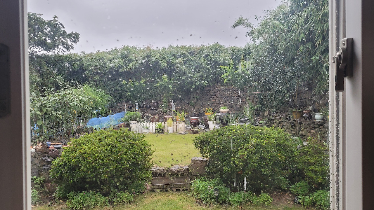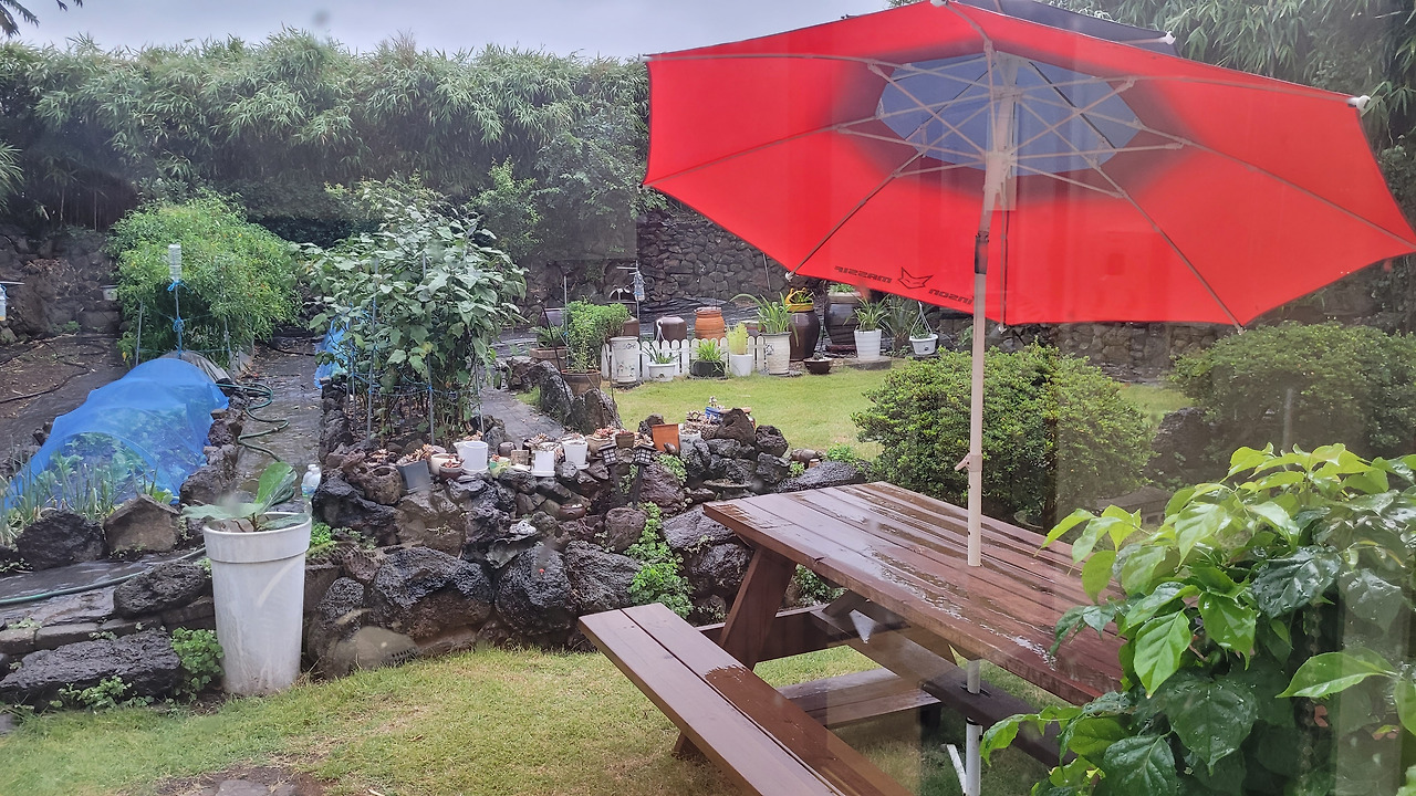 창가에 테이블을 하고 앉았다. 이중창 문을 뜯어내고, 통창으로 원히 보이는 텃밭에는 여유로움과 넉넉함이 가득하다. 비에 음뻑 젖은 모습이 더 맑고, 청량하게 보인다. 처마 밑으로 떨어지는 빗소리는 뚝뚝 시멘트 바닥을 때리면서 비 오는 날의 멜로디를 연주 해준다.