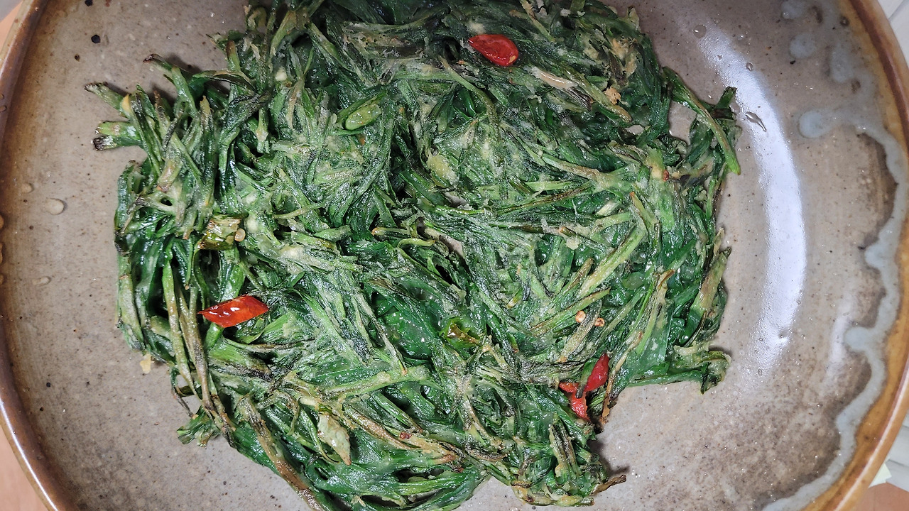 싱크대 앞 작은 창문 사이로 들려오는 빗소리가 feat를 한다. 이내 부추전 부치는 소리는 잦아든다. 냄새만이 집안을 진동한다. 몇번의 뒤집기를 반복하더니 부추로만 가득 채워진 진한 녹색의 바싹한 부추전 한 접시가 만들어졌다. 파란 부추전에 고명인 빨간 고추는 유독 눈에 들어온다. 저것은 분명 매운 맛의 폭탄일 것이다.