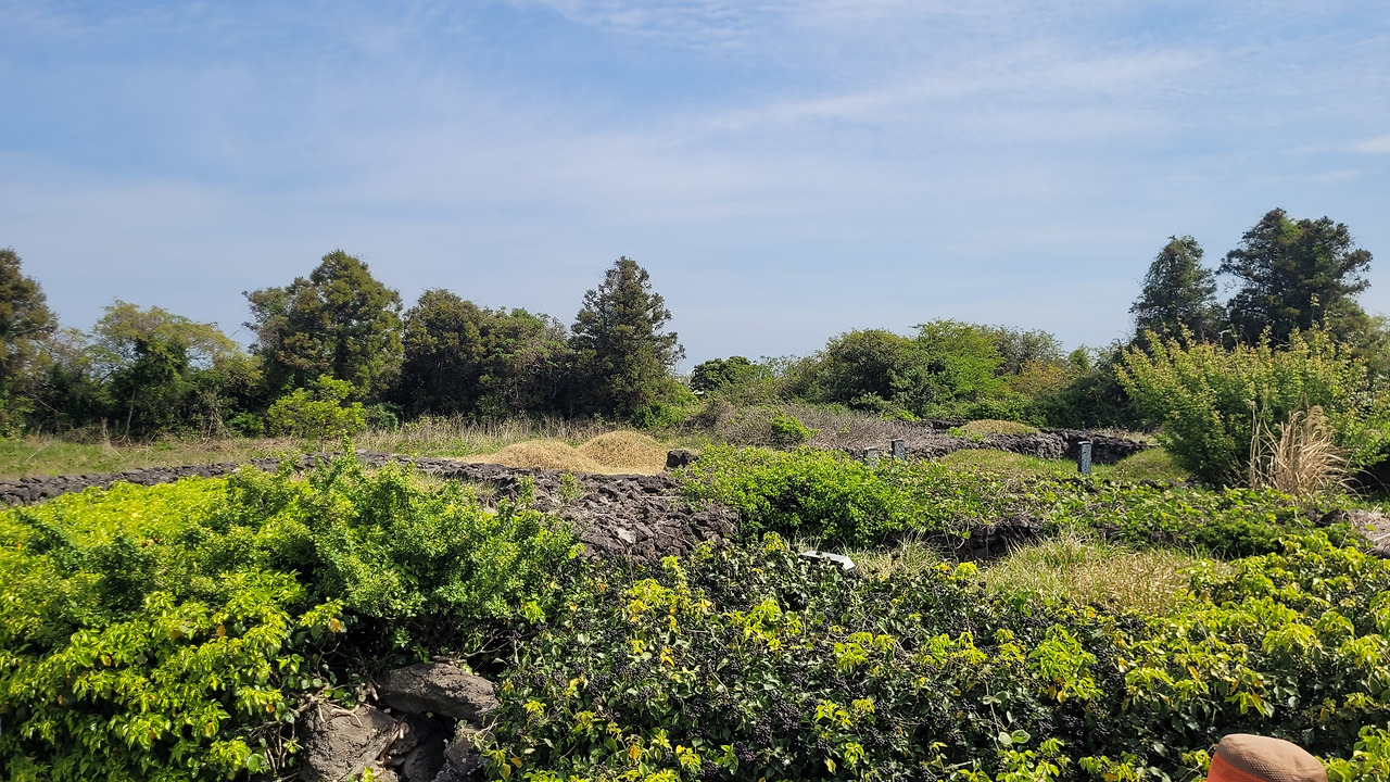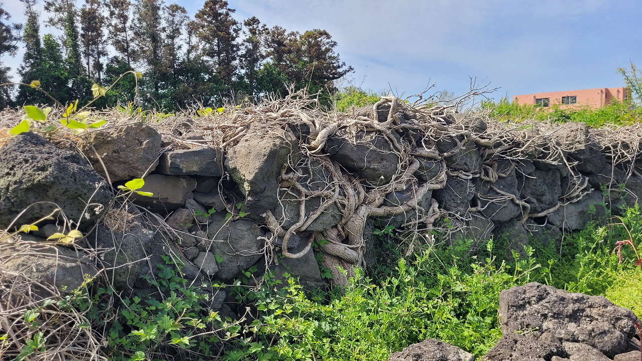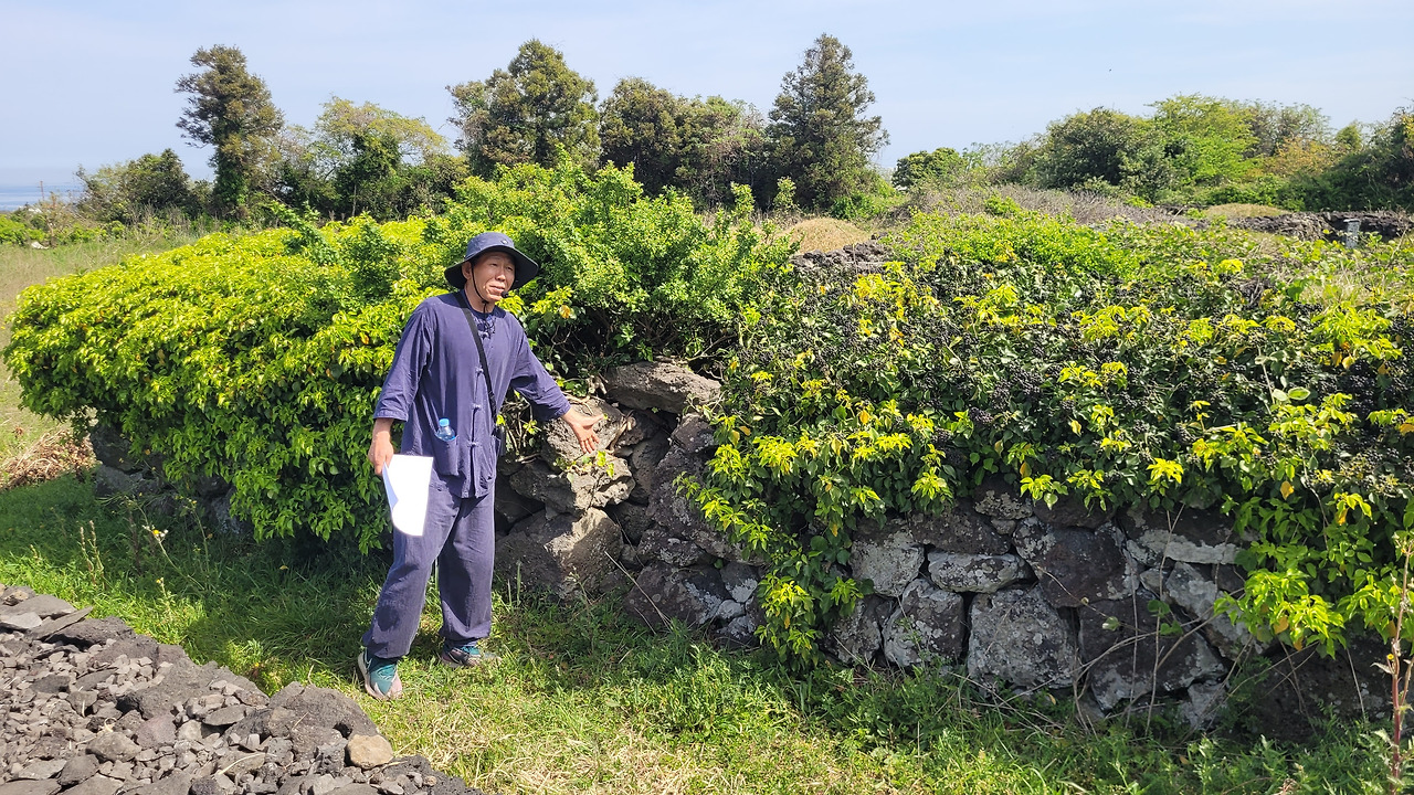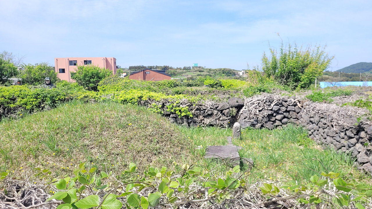 돌담길을 따라가다가 인근에 잡초가 무성한 밭으로 들어갔다. 700여 평의 밭에 묘지가 19개나 있다고 한다. 공동묘지도 아니고 문중묘지도 아니다. 그냥 명당으로 소문나 있어서 묘지가 많이 들어왔고, 현재도 13개가 있다고 한다. 말 그대로 묘지 전시장이다. 산담이 있는 곳, 없는 곳, 비석도 최근의 비석, 아주 오래된 비석, 산담의 형태도 다르다. 같은 자리에서 방향만 바꾸면 다른 산소다. 얽히고설킨 산담의 송악을 보니 버텨온 세월을 짐작하고도 남는다. 죽은 자의 출입문이라는 신문이나 비석, 동자석도 그대로다. 코스를 만든다고 얘기를 했더니 몇 분은 이장을 했는데 이장을 한 산소도 봉분이 개장이 된 채 그대로다. 쌍묘를 쓴 경우 대부분이 남좌여우(男左女右)다. 제주의 장묘문화를 짧게나마 돌아볼 수 있는 곳이다. 그러기에 안내자는 꼭 이곳을 마을여행코스에 넣고 싶었다고 한다.
