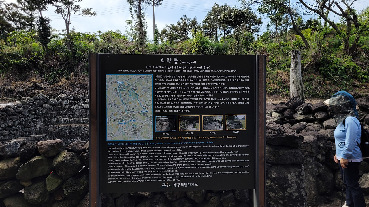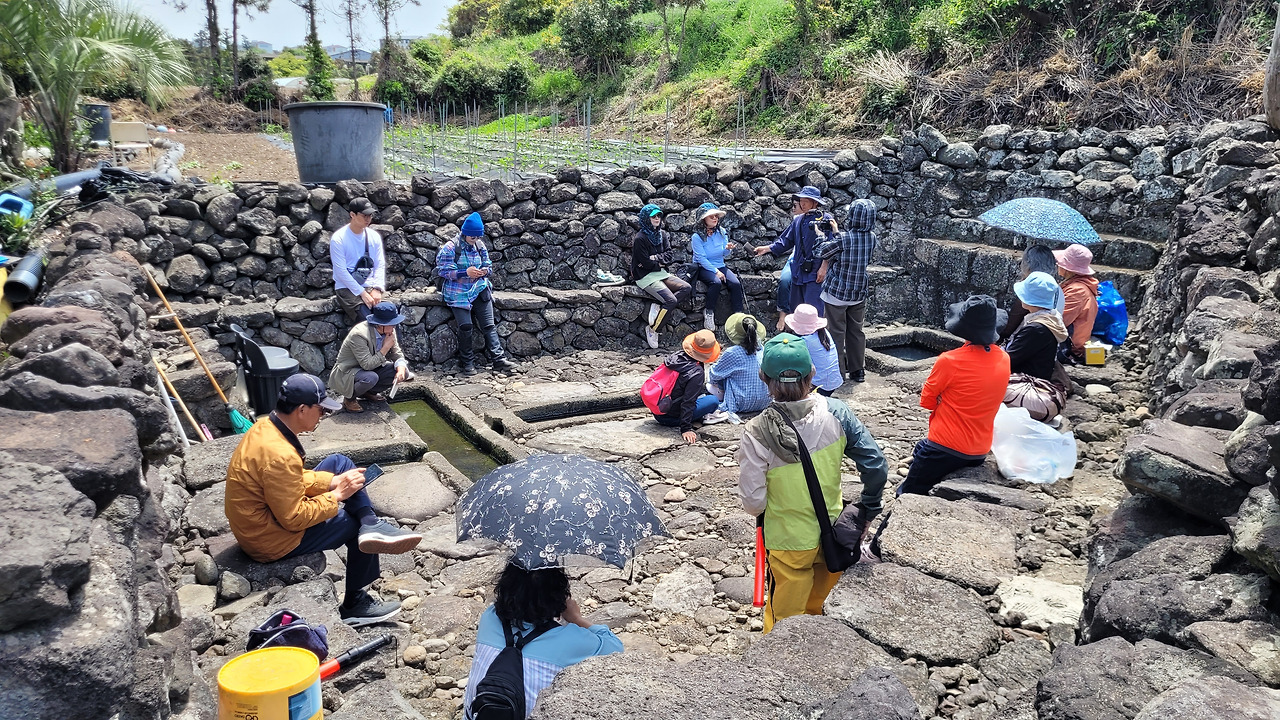 종착지에는 이 지역을 있게 한 생명수인 용천수가 있는 곳에 도착했다. 소왕물이다. 잘 정비되고 널찍한 용천수다. 비교적 원형을 많이 간직하고 있는 곳이다. 않아서 발을 담글 수도 있고, 물허벅을 지어볼 수도 있는 넉넉한 장소다. 모두 곡소리를 하면서 등짐을 풀고 돌바닥에 앉았다.