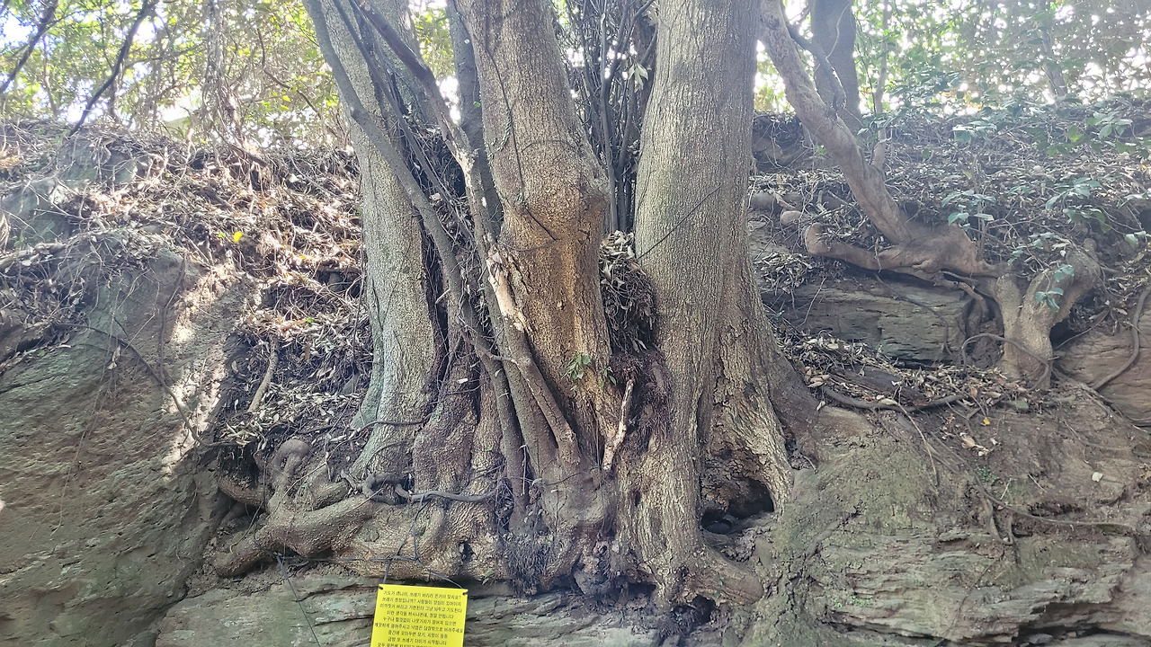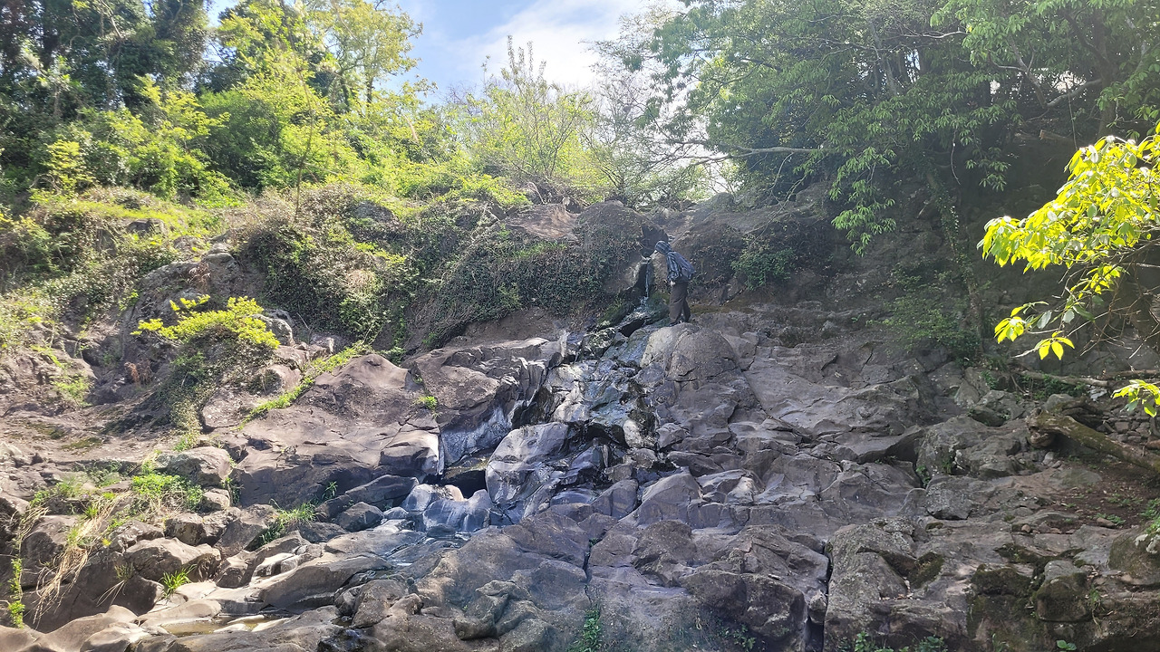 내꾸래기 폭포는 황다리궤 입구로 들어가면 당 맞은편 소왕천에 있는 자연 폭포다. 지금은 하늘도 보이고 훤한데 해설사가 어린 시절만 해도 여기에 들어오면 아무것도 안 보이는 숲 속이었다고 한다. 지금은 건기라 그런지 바위틈으로 졸졸 흐르고 있다.