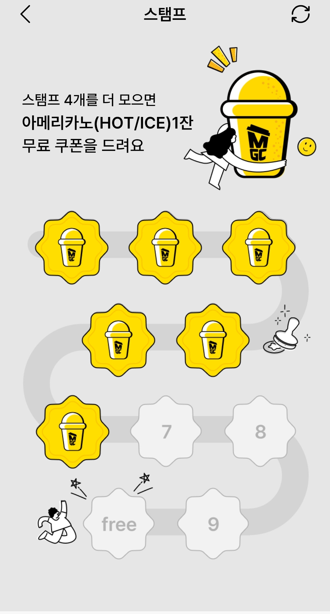 커피 10잔을 마시면 한잔의 리워드 보너스 쿠폰이 나온다.