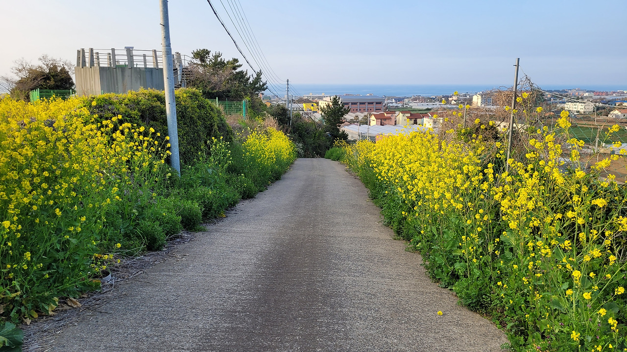 멀리 바다가 보인다. 지금은 봄이라 밭까지 가는길에 유채꽃이 피었다. 꽃길이다.