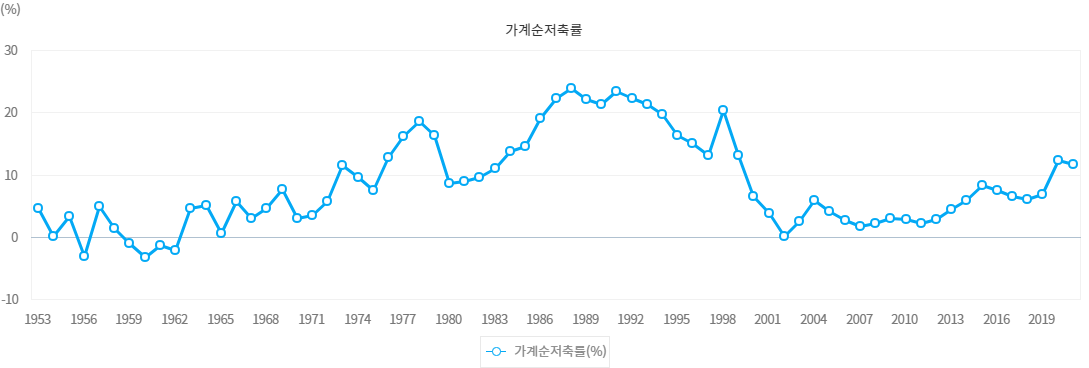 한국은행 자료에 의하면 가계부문의 저축성향을 가장 잘 나타내주는 지표인 가계순저축율(국민계정 상에서 세금과 이자 등을 제외하고 개인이 쓸 수 있는 처분가능소득 중 소비지출을 제한 나머지의 비율임)이 1990년 21.2%에서 IMF를 겪은 2000년 6.5%대로 급격히 떨어졌다. 추후 이런 추세는 지속되다가 2020년 이후 10%대를 회복하고 있다.