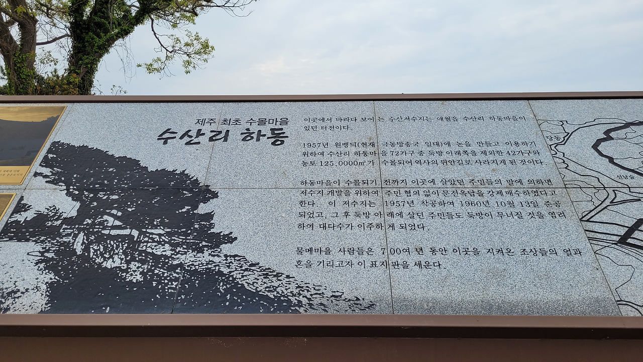 수산봉을 끼고 앞으로는 바다가 훤히 보이는 마을, 몇백 년을 이어온 조상들의 얼과 혼이 살아있는 삶의 터전이었다. 마을주민들의 극렬한 반대에도 온갖 공권력을 동원해서 사업은 진행되었다. 4.3이 끝나고 얼마 되지 않아서 이데올로기에 예민했던 주민들을 대상으로 "반대하는 자는 빨갱이다"라는 덧을 씌웠다. 또는 4.3 당시의 행적을 캐물으면서 공포 분위기를 조성했다고 한다. 42세대를 강제로 이주시키고, 문전옥답을 빼앗은 자리에 거의 맨손으로 저수지를 만들었다.